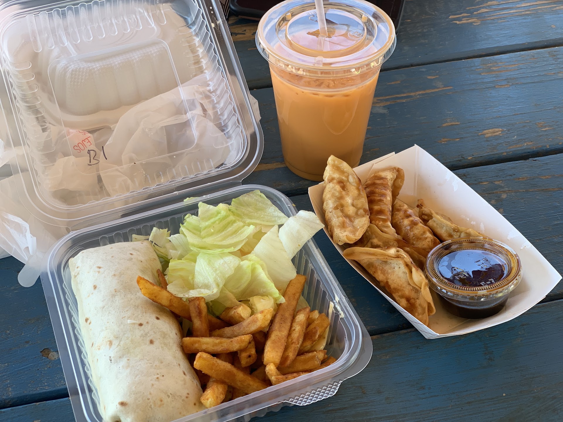 Read moreStopped at this food truck food court, not many were open on Sunday/Mother’s Day And all the options were Mexican except this place being open!! I got green curry with tofu & shared spring rolls with my brother. (Green curry is my go to Thai dish) My food was sooooo good, they made it perfectly spicy everything was cooked perfectly. I even had leftovers! Vegetarian/vegan options here! My brother got pineapple fried rice which looked so goood I almost wished I got his They also have butterfly pea tea, which was too sweet for my taste but a cool experience for those that have never tried the drink and want to. The pho-ritto looked amazing too on their menu, if I ever stop here again I wanna try that. & the papaya salad sounded delicious. Overall, great food truck food court with...
