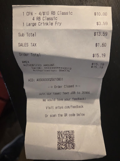 Read moreI have given this Arby's multiple times to have better experiences. I don't normally review things but I feel like I need to. Sometimes I go through he drive through after an evening event I have because it's conveniently on my way home.. However, I cannot go to this Place anymore. Every time over the last few years I have gone in the later evenings, I have had horrible experiences. I order the food, and usually have to wait 15-20 minutes before it's ready. That happened again tonight however all of our food was burnt and the drinks had zero syrup. They were Dr Peppers too and they were visibly out of syrup. I really hope the night crew can step up some because it is really poor quality and customer service. I've worked those jobs before in high school and college- and I think everyone should- and that's why I gave it so many chances. But there comes a point where there is no visible...