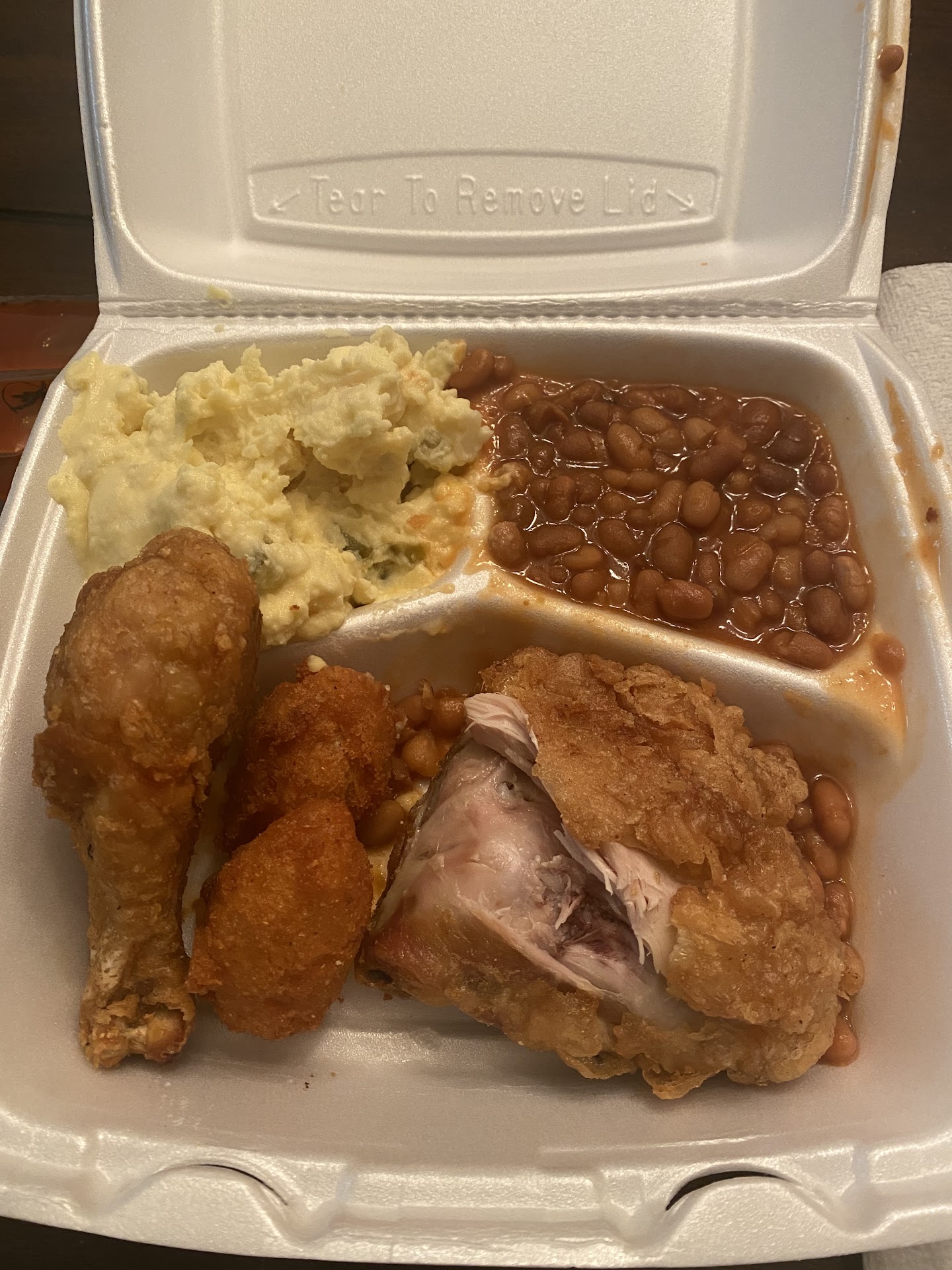 Now I did say the selection of sides was decent, however if you want to eat them is another conundrum. The baked beans, poured out of what taste to be a can were horrible. The french fries were those made from the mother who never really loved her son and would serve these to him to quite his hunger. The potato salad was a mush of "stuff". The one worthy thing were the hush puppies, those are quite hard to mess up in my defense if you've ever made them.
