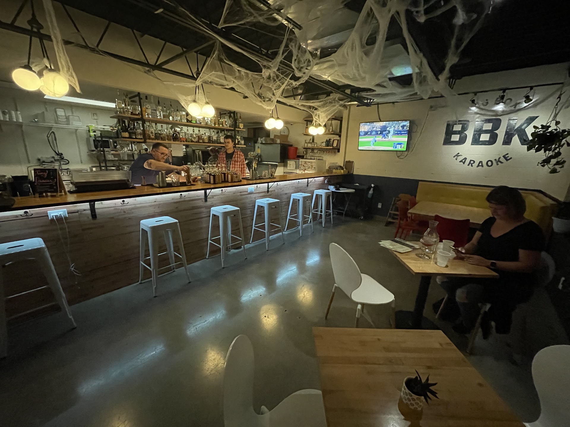 Read moreWe came to Fayetteville for a weekend away from the kiddos and after a couple of failed attempts at some other restaurants we ended up at BBK. Very nice outdoor patio area but it was starting to get chilly so we took a table inside and ordered a couple of cocktails. I had the blackberry smash and my wife had the green tea sangria. They were both excellent. It was a weird vibe because we felt like we were the only ones there but the bartenders were making drinks like crazy, and we realized it was for all the people in the private karaoke rooms. By the way, no public or free karaoke here, only private rooms which was kind of a bummer because I was ready to blow the roof off! We got the BBK nachos and 6 wings. The nachos were nothing to write home about and suggest avoiding them. Credit to our waitress she said as much. The wings on the other hand were downright tasty. We had ours tossed in the sweet sauce with a chili aioli on the side. Wish we would have gotten 12 instead of six and passed on the nachos! Service was good and I would come back if I did not have to pay an arm and a...