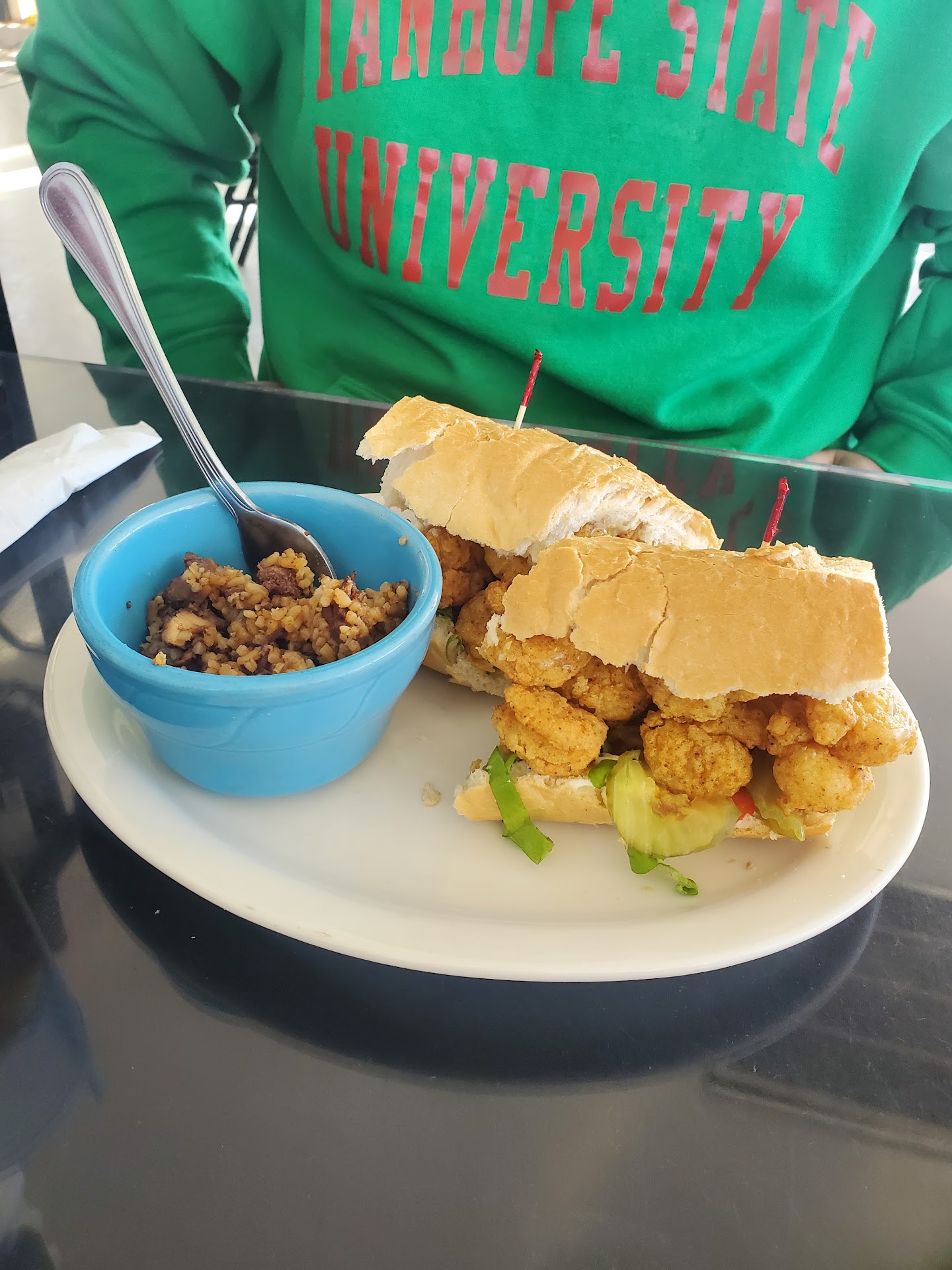 The food was delicious, we tried the fried green tomatoes, the cajun popcorn, and the Gator tots.