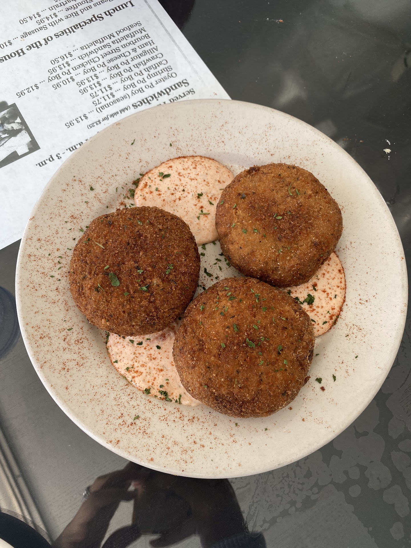 The fried green tomatoes were thin and crispy but packed a punch of flavor, and the tartness of the tomato was well balanced with its fried shell; I've had fried green tomatoes from another restaurant, but the ones from Café Rue Orleans were the most enjoyable.