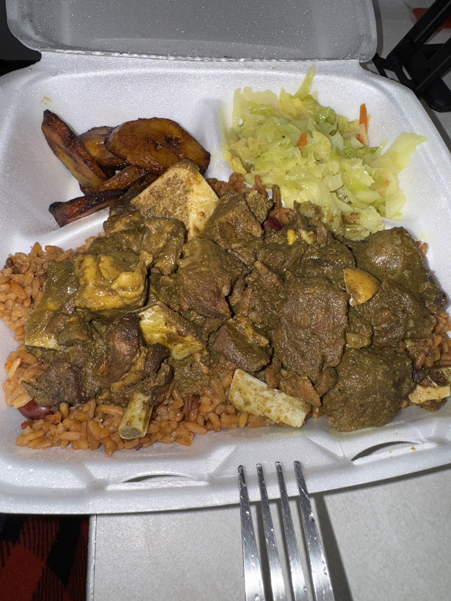 Ā Ā Ā Read moreOrdered: Large Curry Goat with Rice and Peas. Sides were cabbage and plantains.