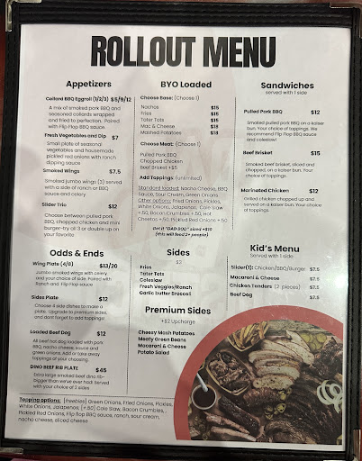 Read moreFood and service wasn’t good at all last night 10/12/25. I realize they are still new but being out of so much food on a busy weekend (egg rolls, brisket, mac n cheese, green beans and queso), I specifically asked for tots as my side and asked for them NOT to be crispy like in the pictures on FB. When they came out they were still fried hard and crumbled when I put a fork in them to eat. The mashed potatoes had a very gritty texture, looked almost like grits. But the icing on the cake was sending out cold food when there was only 1 other table in the restaurant and the server having an attitude when she over heard me talking to the table how the Dino rib was not even remotely warm. Just an overall bad experience...