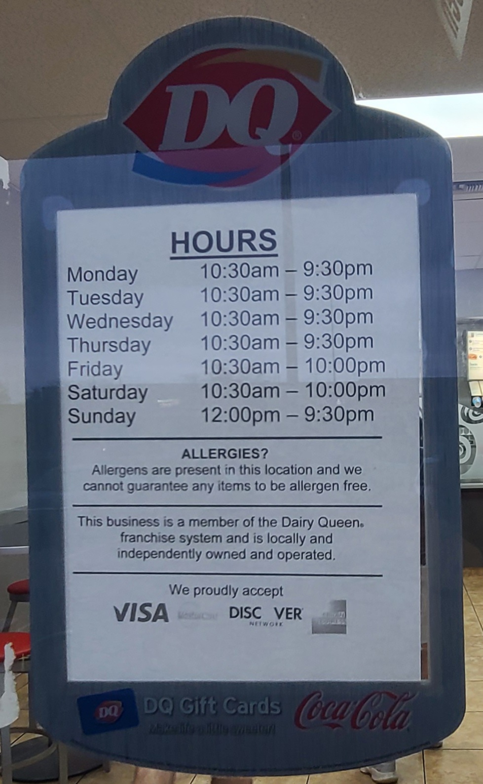 Read moreI arrived at 9:40pm (like normally do) I a chocolate ice cream cone and blizzard (everything was fine) They tell me my total and ask me to drive to the window great. . They open the window and give me my blizzard but regret to inform me they had JUST cleaned their chocolate ice cream machine (allegedly)…. but when I ordered 4 minutes ago it was okay & available. 7/10 times I come to this store the ice cream machine is down.. being clean…”just exploded everywhere” or down. It’s is very aggravating to drive there… waste my gas for them to “close up” early. I worked at sonic for 3 years… where we are running just as much ice cream as DQ and never had problems we couldn’t work through… there is no problem in having a bad day or a machine being down. But this is a constant… and a pattern which is creating a bad narrative for this DQ. I will say I have no problems when I attend this establishment during the day but at night I literally can never get what I order.I will add—- the service is always very nice and respectful.. but it’s the simple fact of DQ not serving to its full service . God forbid a girl want a...