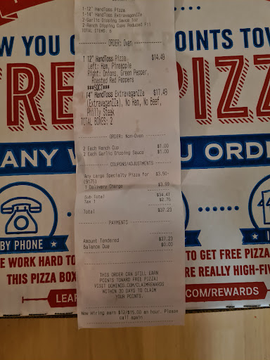 Read moreMy opinion about this particular location is that it needs to be checked by the Domino's Corporation. Twice in a row I ordered from this location and both time the quality of the food sucked. Both times I received over cooked/burnt food. The first time I didn't leave a review even though I should have. I ended up going to the store and at least they replaced the order with a fresh product. The second time around wasn't that easy. I ordered for my wife and I her food came extremely burnt. When I called I was giving a hard time but the eventually opted to redeliver her food. We sat and waited, waited, and waited and they never showed up. By the time I realized the time my wife had fell asleep without eating and they were closed. The next day I took the uneaten BURNT food back hopeful that I could have fresh food by the time my wife got home from work. I was told my order couldn't be replace because their system said I was redeliverd and was treated like a broke hungry lier. I left a review this time and was quickly contacted by a Nicole claiming to be the franchise owner and to please reach out so she could rectify the incident. When I reached out I got no response. So I waited a week and reached out again. Still no response leaving me to realize they not only don't have their stuff together on any level of that franchise. Don't reach out if your not going to follow through. They respond so others think they stand behind their customers but they don't. I miss the store that was in my last area.