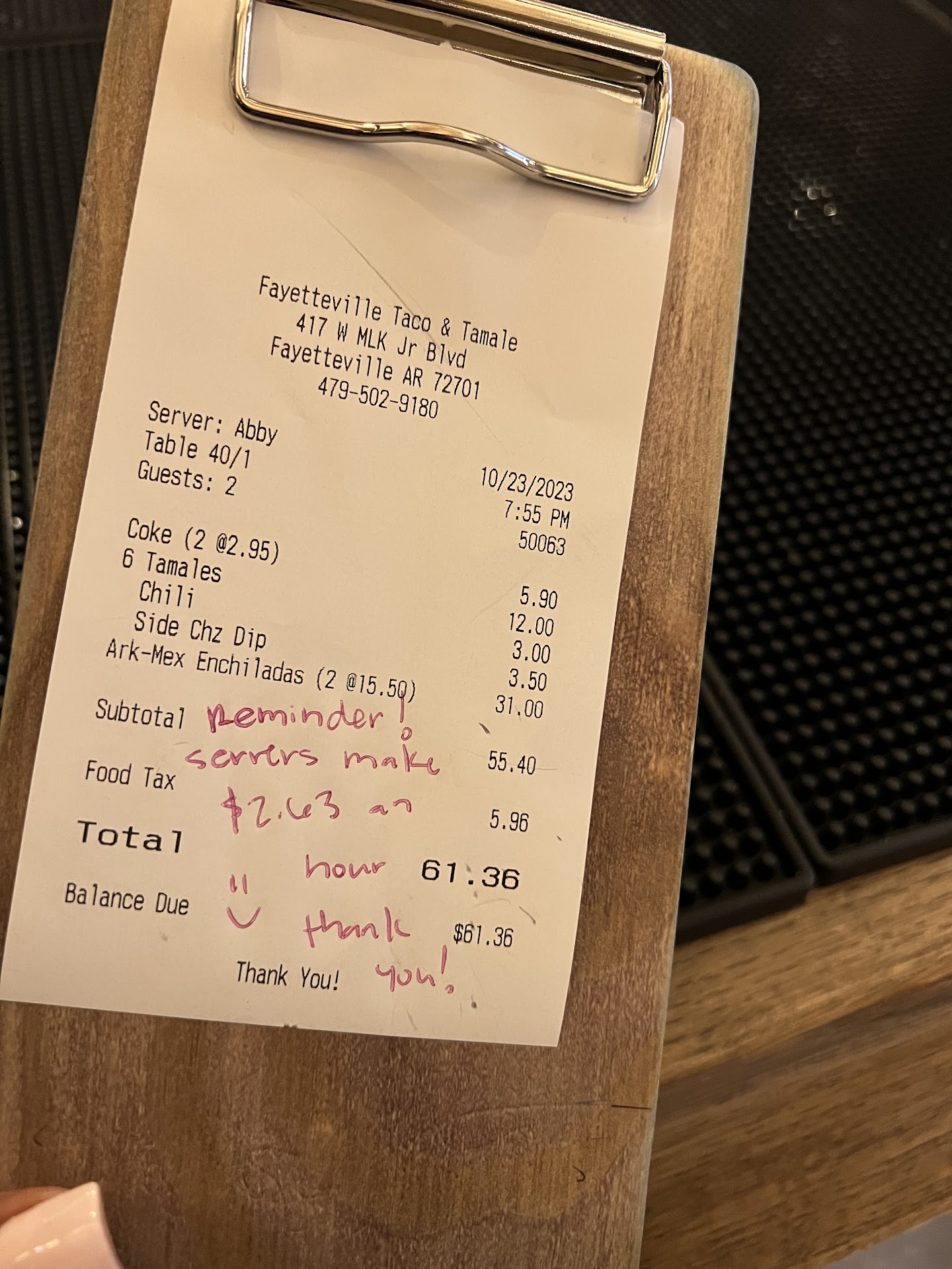 We didn’t complain or ask to speak to the manager or anything that would suggest we would not leave her a tip. I had on dress pants and a button down. Nothing would suggest that I wasn’t mature and smart enough to know that waitresses don’t get paid much yet she left a note on our receipt that read: “Reminder! Serves make $2.63 an hour thank you!”