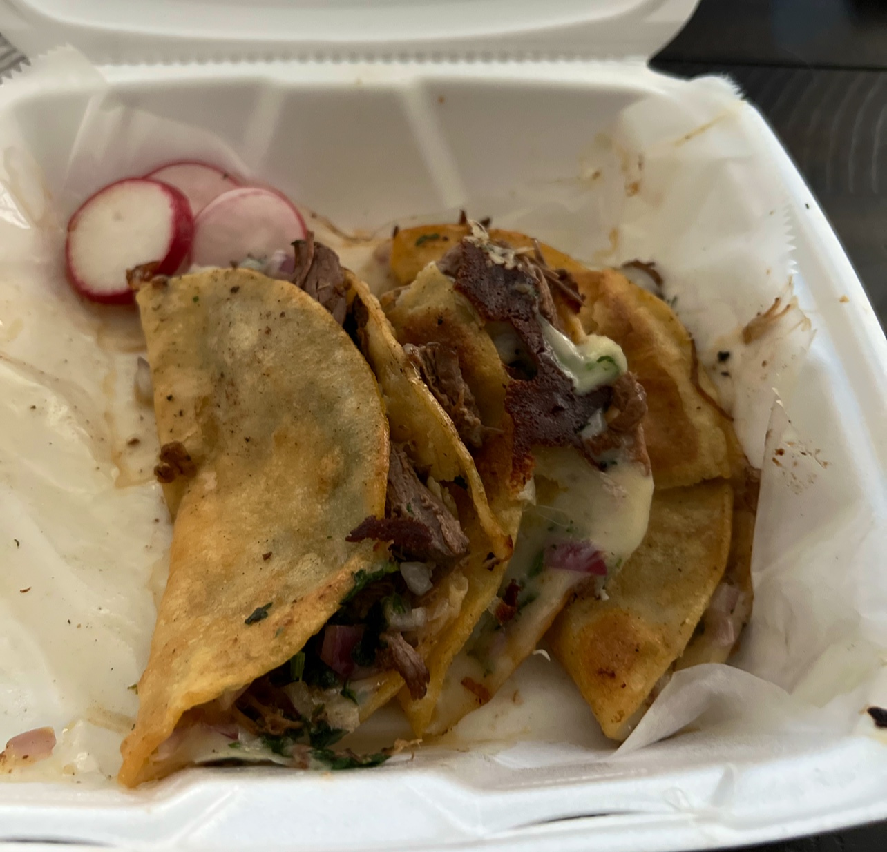 Second Visit: I decided to try the Quesabirria tacos, hoping for redemption, but it was another letdown. The tacos were bland, soggy, and missing the essential consommé. To top it off, there weren’t even any limes to add brightness to the dish. How does that happen with a dish that relies on bold, rich flavors?