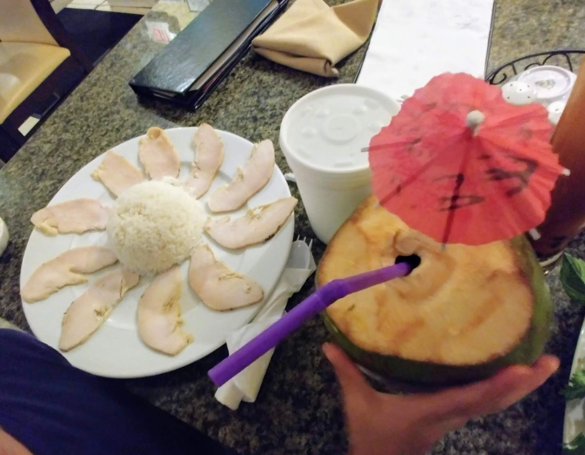 We had an order of Pho, chicken and rice off the kid's menu, bubble tea, and a coconut.