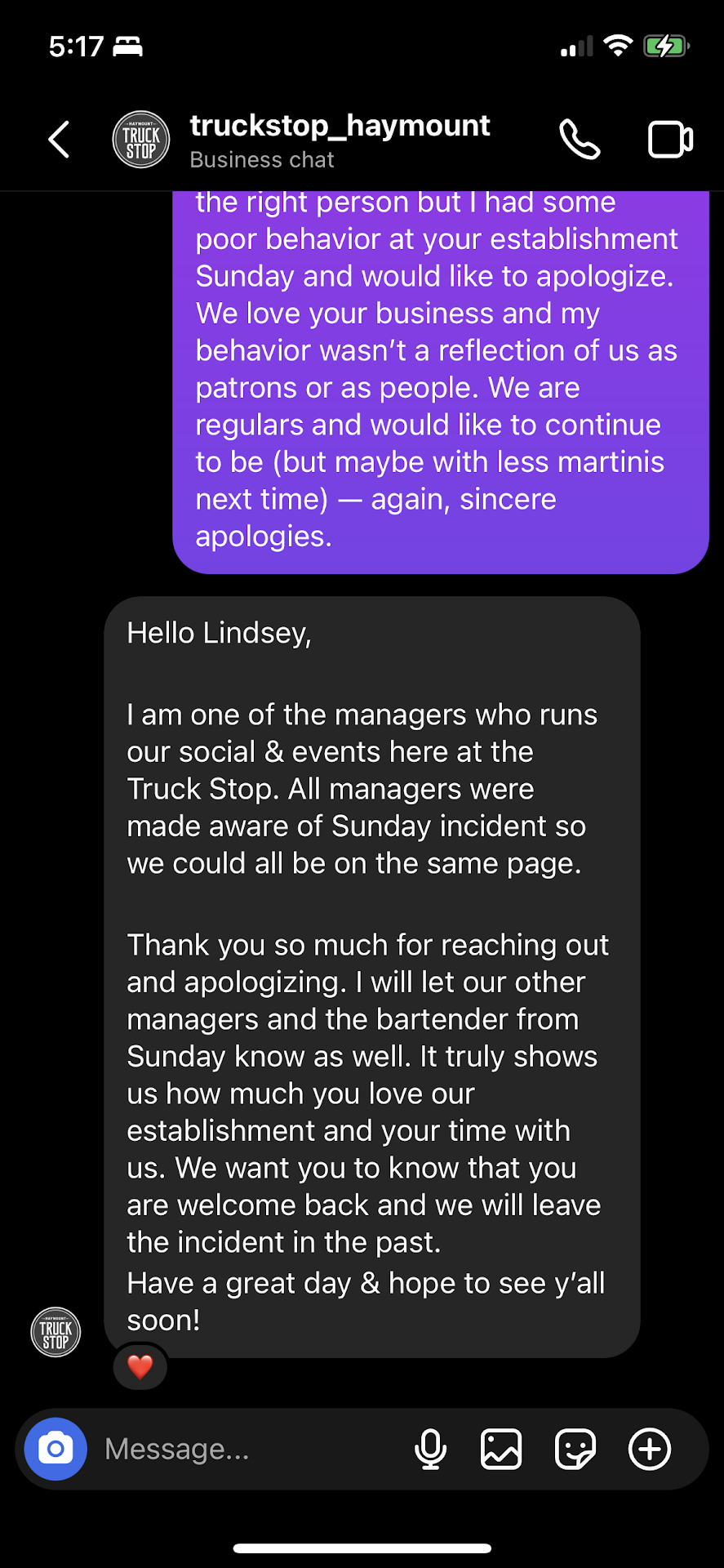 MULTIPLE months ago I came here for a weekly visit like I do with my friends, and I had too much to drink and was rude to the bartender. Which plenty of people in this town who I know, and who know me, know this is out of character for me. I went out of my way to apologize the next day and received a response from TruckStop thanking me for my apology and said I am welcome back and the incident would be left in the past.
