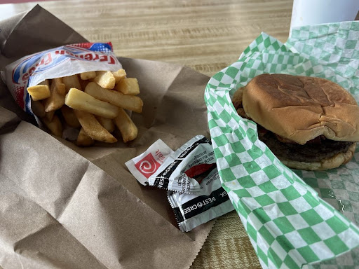 Inside there are about 6-7 small tables and a spot to order at the counter. The menu consists of classic American fast food options, like burgers, chicken tenders, and fries. It reminds me a little bit of a drive-in spot just because it is so nostalgic-feeling.