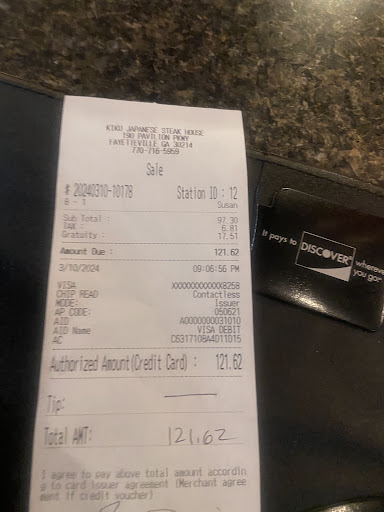Read moreI want to start by saying I (used to) like this restaurant and it's not my 1st time visiting this location. Unfortunatley my recent visit on Saturday 4/24 was not a good one at all.  We were seated after an hour wait time we were told it was an hour wait and we decided to wait.. The dinning area we were seated in on the LEFT HAND SIDE of the restaurant area/table #2 OR #3 If you are seated in this area, ask to be changed, as there is a terrible SEWAGE ODOR that came up and it really spoiled our dinner, the smell arrived as we were finishing our meal. I guess I should have realized there was an issue when were being seated another couple on the other side of the table was asking to be reseated. We didn't know why? At the time we sat down we didnt smell anything , we assumed they maybe wanted a certain waiter or Chef , we didnt smell anything ( at that time).  After being seated we waited an hour before the chef came to prepare our food. Once he got there he said, one of the Chef left and they were short staffed. The food was all prepared and we were trying to enjoy our meal, but by the end of our dinner the SEWAGE ODOR appeared and was overwhelming, we could not get out of there fast enough. There was a family on the other side of the hibachi grill who heard me say something about the smell and they said they smelled it as well !! I mentioned this to the staff and he said "oh he didnt know that there was a smell" I said well how can you not know bout the odor if you work here, he then said "there was a smell before but they had it fixed" ?? Obviously it hasn't been fixed!!!.   I think this restuarant makes more than enough money to get there plumbing problems fixed. Can't blame the odor on the pandemic!!  This is certainly something health inspectors need to be made aware, this can truly make someone sick. Who wants a sewage smell while trying to eat.  I probably won't visit this location in Fayettville again and if I decide to visit another KiKu it probably will be the one in Campcreek. I can't give more than 1 star, the food was good but that Odor makes it negative -100 stars. Please fix the ODOR...