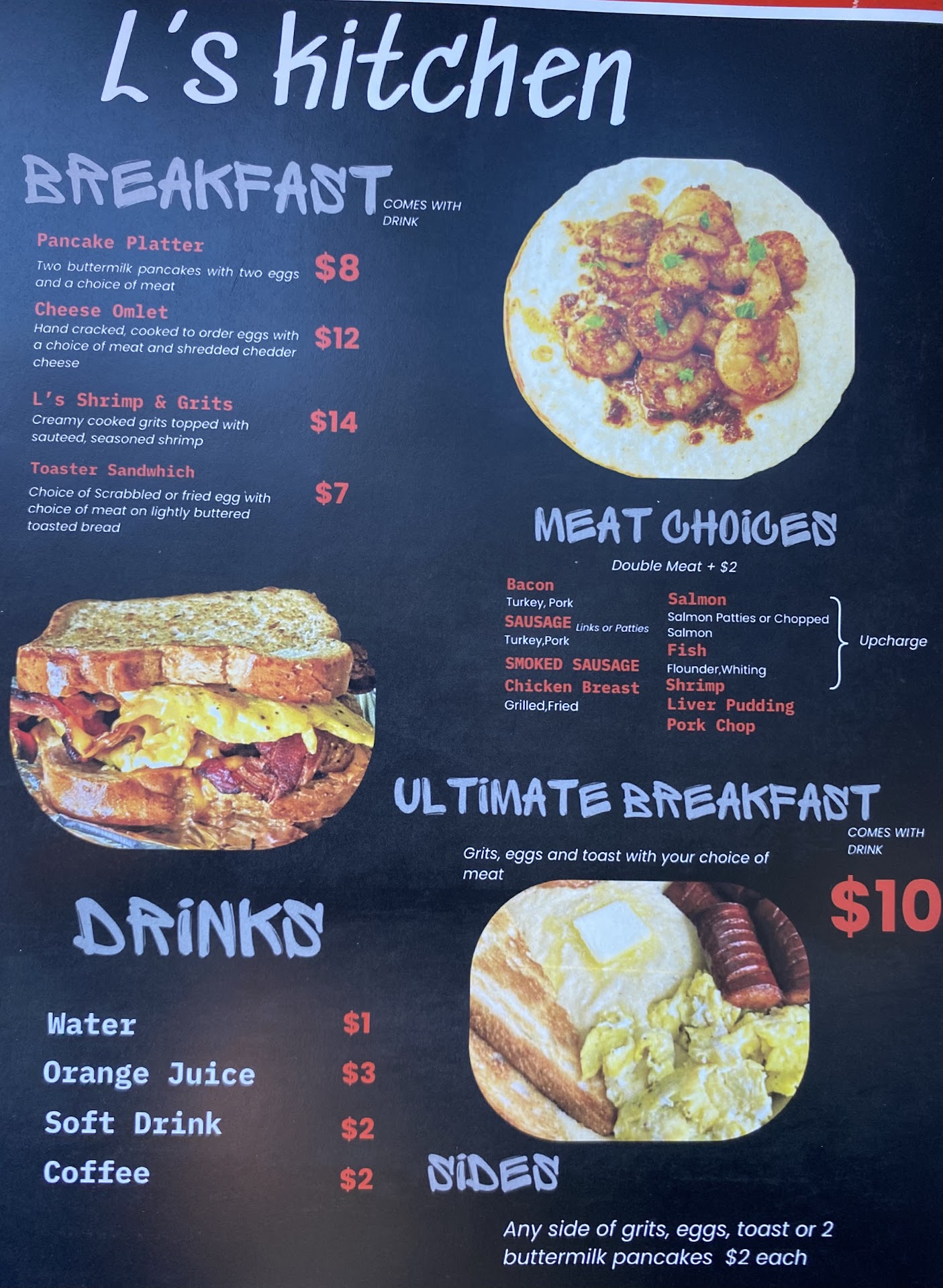 Wonderfully Prepared 2 hot dog and French fries meal. Looking forward to sinking my teeth into The shrimp and grits breakfast platter with salmon. The owner/head chef takes great pride in making sure every customer gets their meal freshly made upon order! Patience is a virtue that pays off when choosing to get the best value for Top Quality Food prepared with your Health in mind! L takes great pride in making sure everyone of his phenomenal platters are prepared exclusively and exactly how his customer's request their food made! Nothing is sitting around already prepared so you never have to wonder how old your meal is not even the French fries! He really wants his customer's to know just how special their business is to Him! Check him out and see...