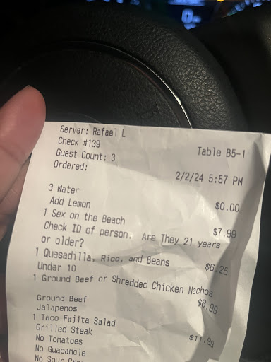Food: Shrimp quesadilla. Seasoning was actually good. But someone clearly added salt to the shrimp at some point during the cooking process. (Salt crystals were visible. Your chef should know what that means.)