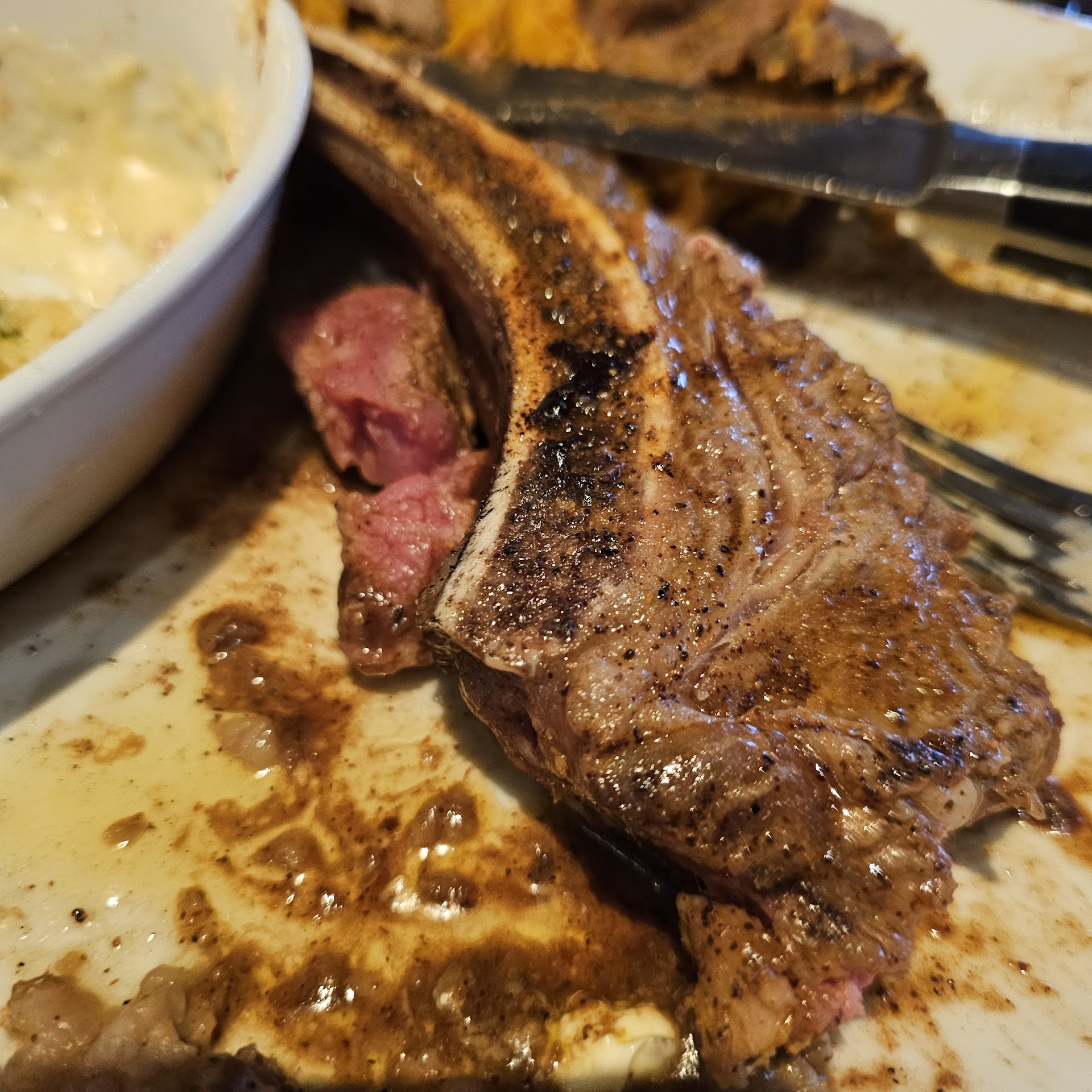 Read moreWe go every year to celebrate our Anniversary and my birthday. I always get the Outlaw Ribeye with my sides already boxed to go since I know I can't eat them and the large steak. The steak was ordered Medium. It came very rare. Almost moving. I politely asked that it be returned and cooked to the requested medium. The Server brought it back in a TAKEOUT container. They did put extra mushroom and onions and gave an extra of Mac amd cheese. I had to then request a plate since I was still obviously dining in. The steak was still very very rare and cool. Obviously never went back on the grill. Now I can eat a rare steak, but prefer medium. After a few bites, I just could not look at the blood oozing out of the steak so I boxed it up and kept boxing all the excess stuff. Table gets very crowded with all the takeout. We actually ordered a to go for our neighbor. It was brought with our order at the beginning. So it sat there and took up space. Normally, our Server waits until we finish. Well, despite all this I wanted a Birthday dessert. It came and we managed to find space to eat most of it. I guess Longhorns doesn't acknowledge special occasions or Military Retirees with discount. We paid our 84.00 and left a generous tip for the Server. He must have been new. I think next time, we drive a bit further and go to the Rogers location. I will know to order it Medium Well the next time. I might get lucky and get an nice steak that has been cooked longer than cutting off the horns and flying it...