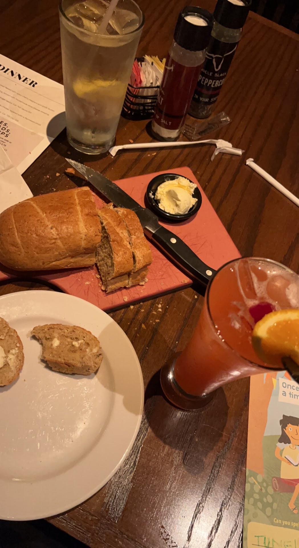"No bread tonight." That was a first for us at a Longhorn establishment however, the food was amazing. My girlfriend had the Ribeye with asparagus. My gentleman friend had Ribeye with loaded baked and potato soup. I had the salmon with brussel sprouts and upgraded to the strawberry pecan salad. The sauce the steak is cooked in is just heavenly and their salmon? I have tried salmon in several high end restaurants but nothing compares to Roadhouse salmon, absolutely THE most delightful experience one can have with a fish! My gal pal and I are devoted to trying to replicate those brussel sprouts which I don't even like with the exception of Longhorn's and that strawberry pecan salad is divine. However, our food was brought before I could get more than a few bites into it and there was no room for everything so I asked our waiter if he could box it for me? He came back to the table with a little box, picked up that huge plate (I'm thinking, "What is he doing...") and proceeds to dump that huge plate of salad over the little box that was half the size of the plate letting it spill all over the seat next to my girlfriend! His behavior throughout had made us feel like he was called in on his night off, we wondered. We were there the evening of January 22, 2024 from approximately 7:30-9, spent $155. for a nice time together and he didn't ruin it for us (we're too fun to let that happen) but, maybe management could remind their servers that people like to be treated the same way they would like to be treated if the tables...