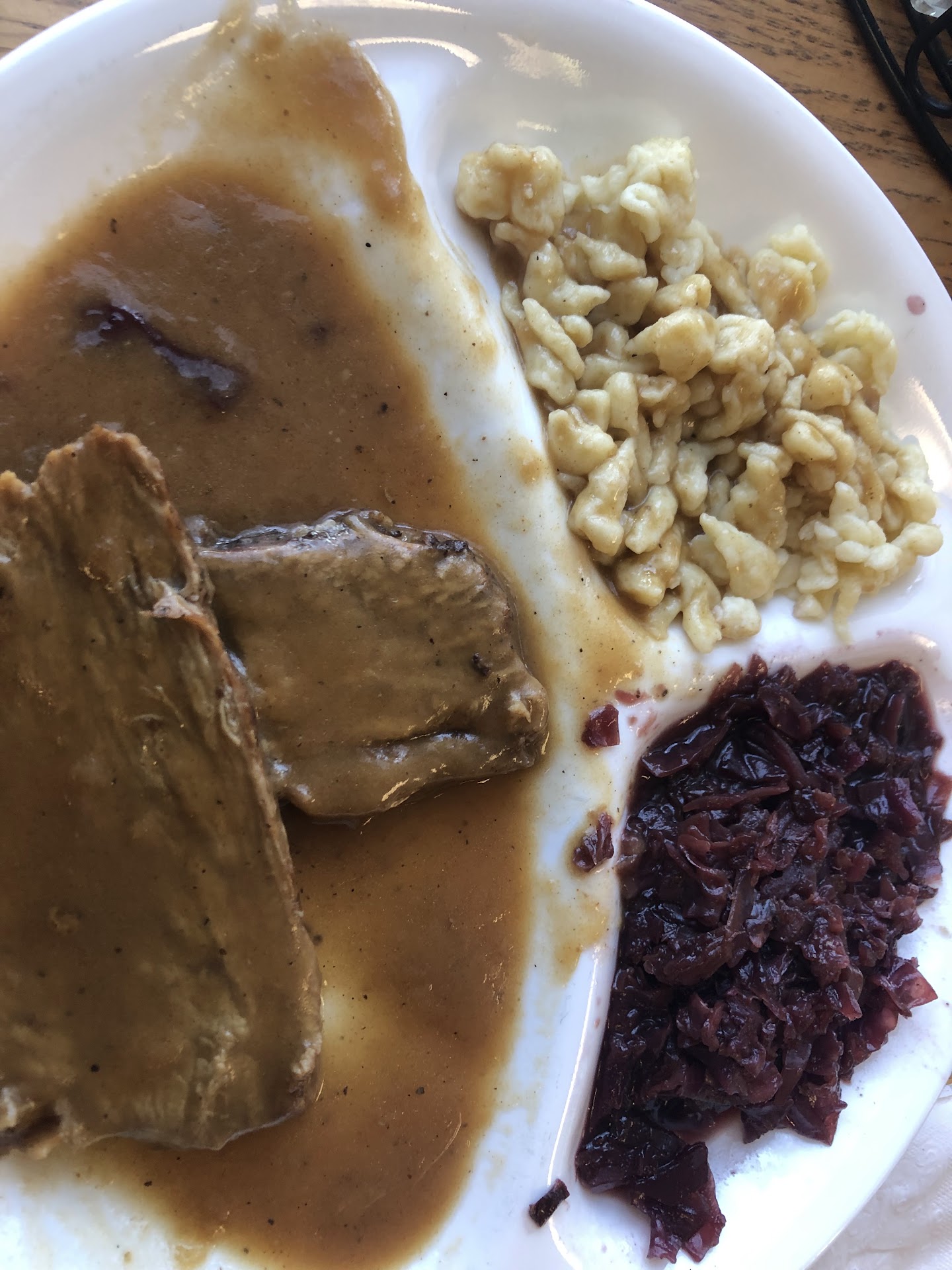 So I do love well prepared sauerbraten with warm German potatoes and and red cabbage Sadly not much of an offering the triangle area of North Carolina so I cruised to Fayetville. Where this place had sauerbraten on the menu. Off I went for my one hour and twenty minute drive to get there. The ambience was so so. Don’t have the feel of a German establishment. But I didn’t go for the interior I went for The food. The nice waitress that took my order said she would check to see if there was any left as it would sell out regularly. That’s where it went down hill. If you’ve ever had sauerbraten you know there is a tangy vinegary sweetness to the beef roast. And that blends so well With red cabbage. Alas what came out was roast beef with a brown gravy that tasted like the roast beef I get at Golden Corral. Now don’t me get wrong it was very good roast beef and gravy . But not sauerbraten by any means. So don’t go there for sauerbraten. I’m sure Their other foods are wonderful. We he black forest cake was epic.