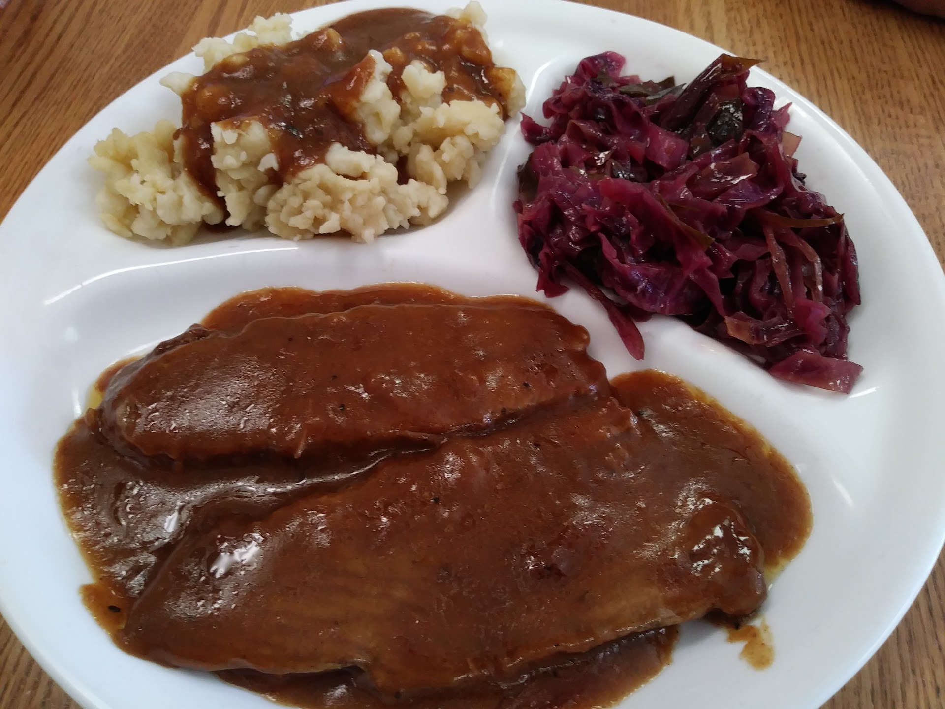 That’s where it went down hill. If you’ve ever had sauerbraten you know there is a tangy vinegary sweetness to the beef roast. And that blends so well With red cabbage. Alas what came out was roast beef with a brown gravy that tasted like the roast beef I get at Golden Corral. Now don’t me get wrong it was very good roast beef and gravy . But not sauerbraten by any means. So don’t go there for sauerbraten. I’m sure Their other foods are wonderful. We he black forest...