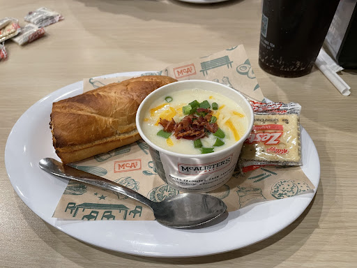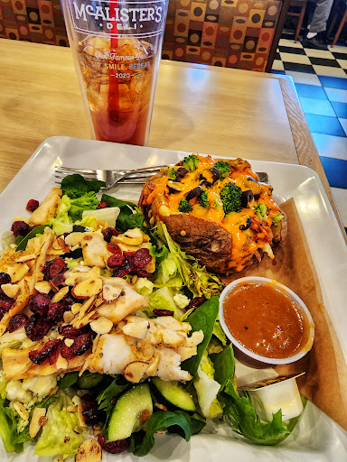 I love McAlister's Deli. I worked at one as a teen, and I have been eating there for years. We have probably eaten at atleast 15 different locations. This location in Fayetteville is the ONLY ONE that nickels and dimes you for every little thing, unfortunately. Literally, everything you ask for is a fee even if it used to or should come with the item like sour cream for a potato, 2nd dressing for a large salad (75 cents+ for each). And half the time they forget the condiments or toppings anyway, so you always have to go up there and ask. They also have made their cup sizes much smaller than they used to be for dressings/sauces (1-2oz) yet they still only include 1 whether you have a side dish or a full size. Also this may have been a 1 time thing, but I ordered a sandwich to go before, and it wasn't even in a box. Just wrapped in paper and placed right in the bag so it leaked all over and got crushed. I asked the employee if they always serve togo orders like that, and she said yes, which I had never seen here. Another corner cut? Their prices are also higher than other locations we have been to in nearby Missouri. I still go once or twice a month, though b/c I love the food, and it's the only one in the area (next closest is Bentonville and it is the same owner). Here are my favorite menu items : giant stuffed spuds are all good but Spud Max is my fave, Reuben and Rachael sandwiches, signature Club sandwich, Chicken Tortilla Soup, Jalapeno Turkey Crunch, Savannah Chopped Salad. Also the Sweet Tea is my fave always and you can buy a refillable tumbler for 99 cent refills (not sold here that I have seen but bought in Missouri). Best deal is the Choose 2 option. They also have kids eat free on Monday nights. The staff is mostly nice and helpful although I have never been asked for a refill of my drink when I am eating my meal like other locations do. There is a female manager that always looks angry but everyone else smiles and greets people for the most part. Also get the app. It saves you money and you...