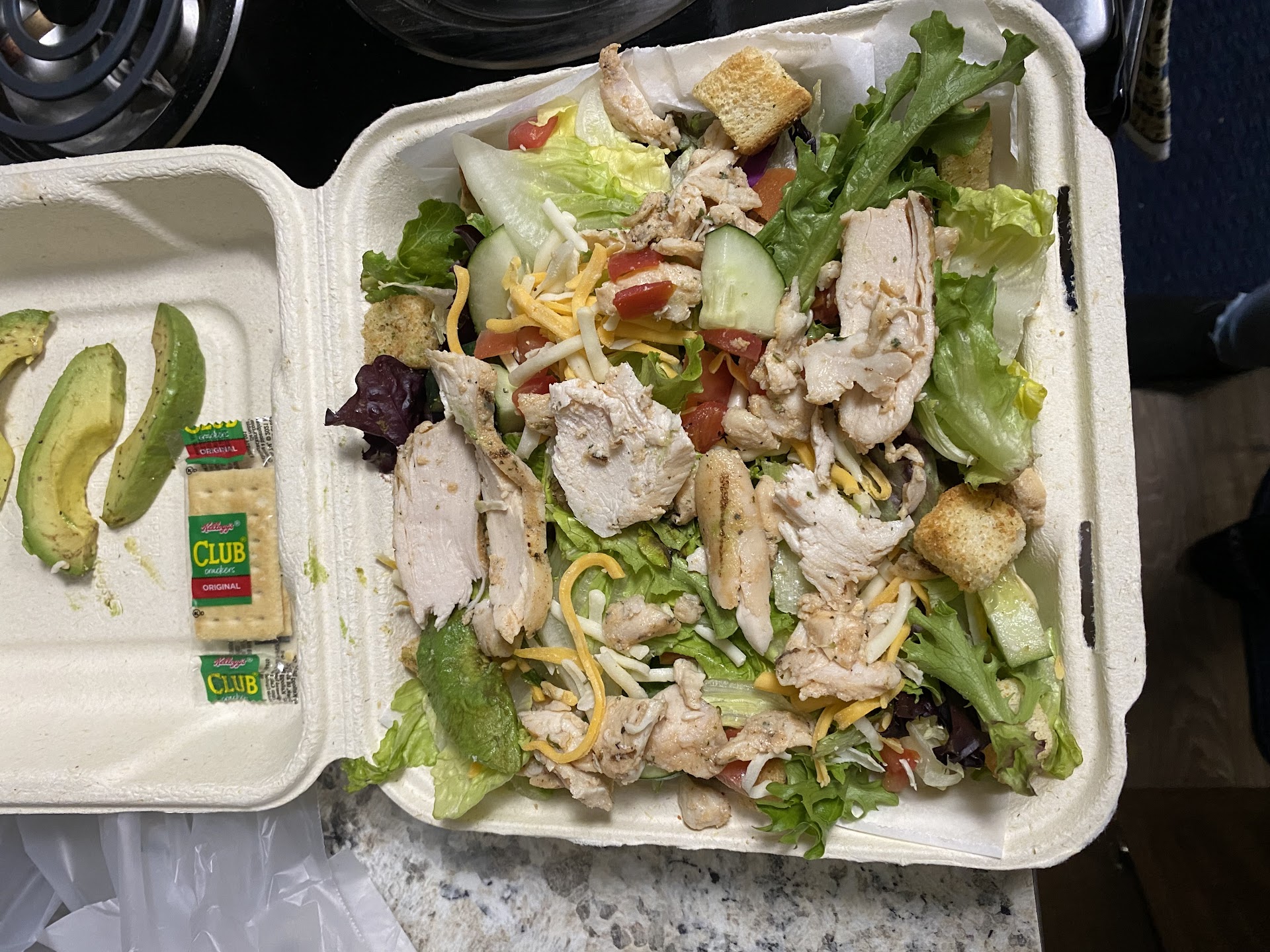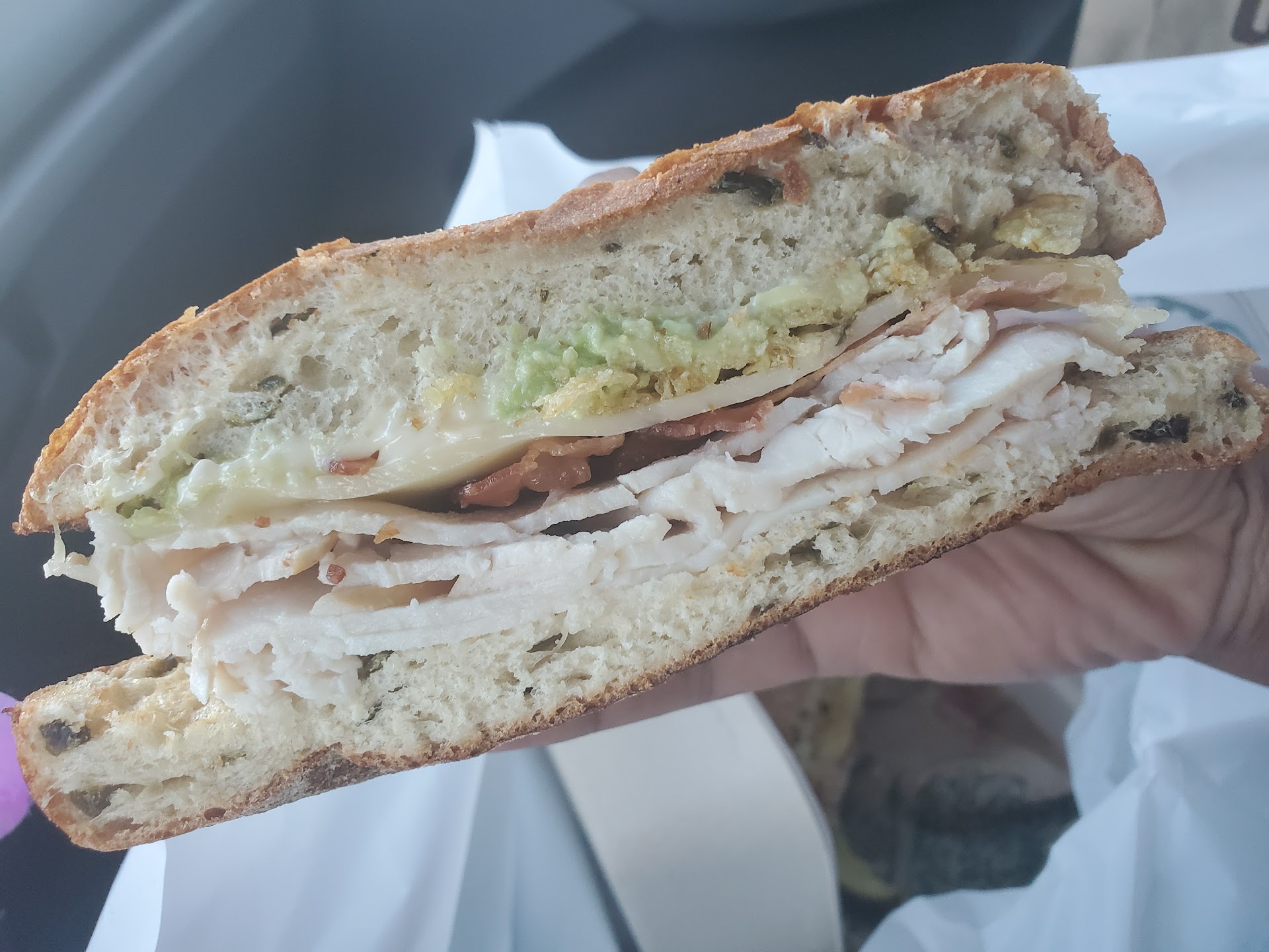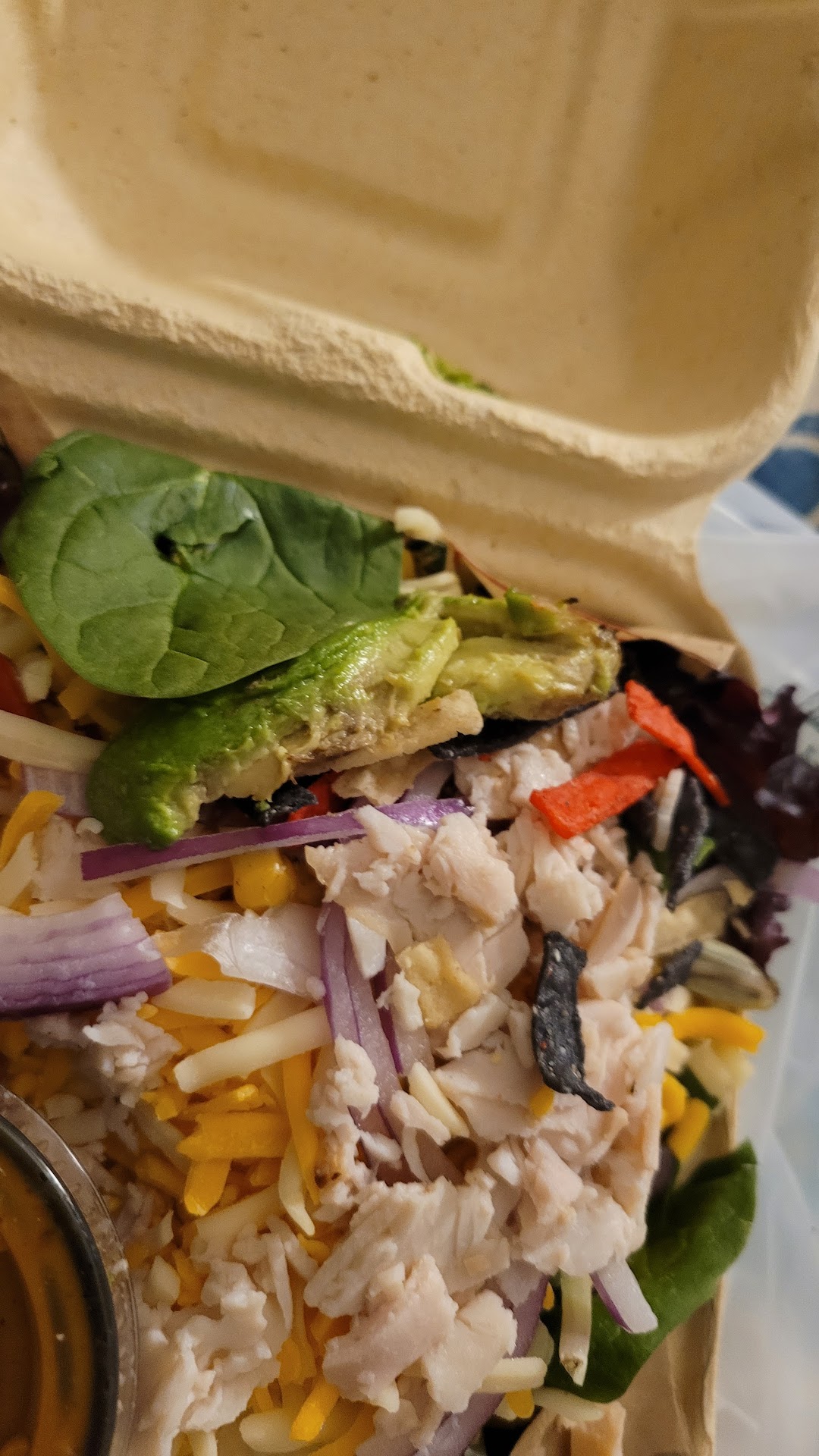 I ordered online guest curbside. Order set to be ready 15 min from order at 830pm. I arrived about 25 min late and they informed me when I called to have someone bring the order out that they "ran out of chicken for the Southwest Chicken & Avocado Salad, so you want no meat or another meat? " i sub turkey on the salad. Of course I want meat, I didn't order plain salad. I go inside (no one at counter) to wait since my order will not be made accordingly- there's only 1 customer in the entire store besides me and they're eating. I'm informed the salad is being made. Few minutes later I get my order. I get home 15 min away and the Spicy Turkey Melt that I ordered with cibatta- the BREAD ROCK HARD AND CAN NOT EAT IT. there's no way with me even being late to pickup that the bread is rock solid from just sitting, it would just be cold. The "turkey" i chose since they "ran out of chicken" is just sprinkles of tiny cut-up pieces of turkey and not even the slices used for the sandwiches- it was something you sprinkle on the potatoes. The salad is a rip-off and the sandwich isn't edible. The chili was still temperature enough to eat. The fruit cup was mediocre.