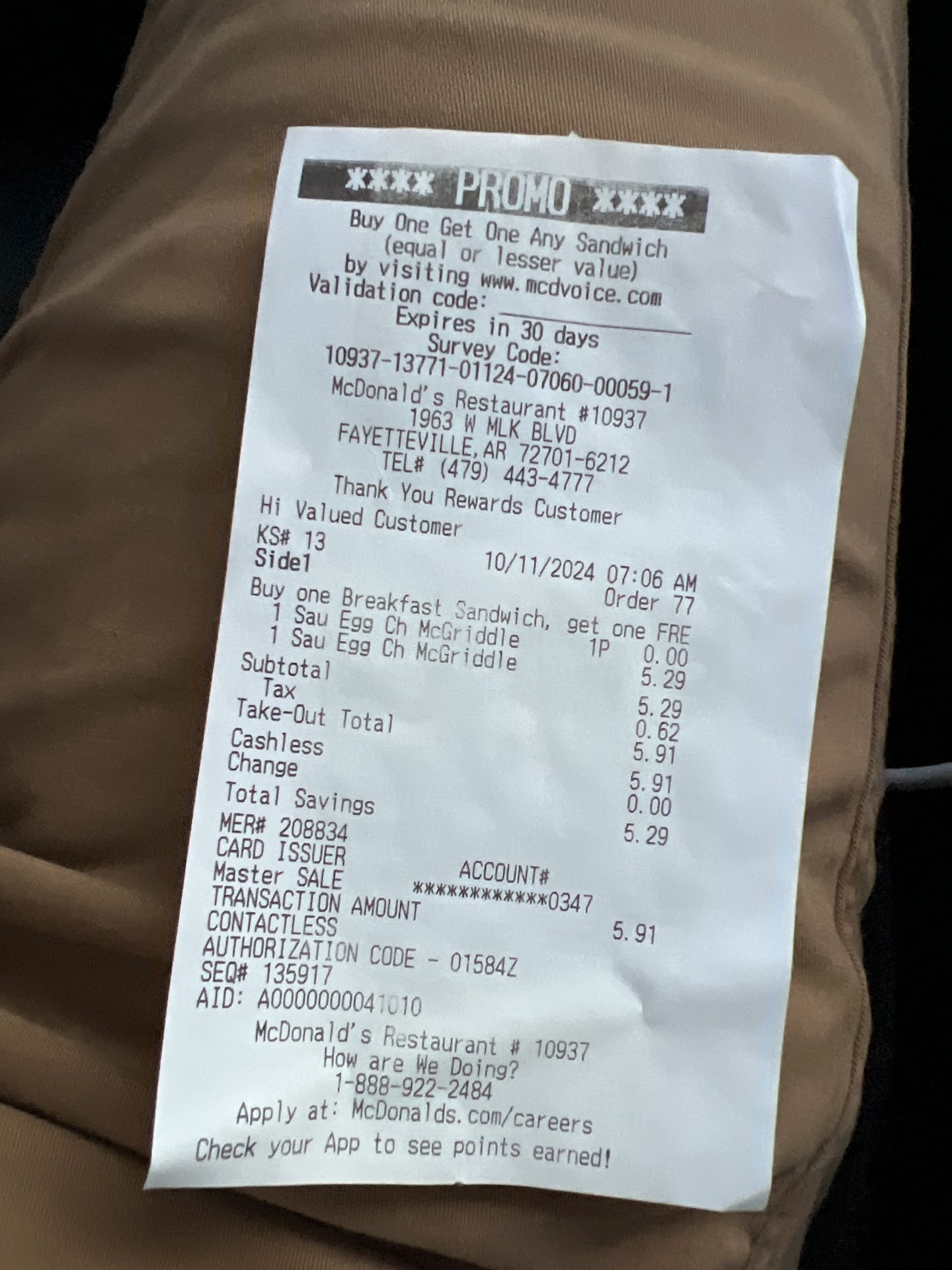 Read moreWhen I entered the store, I immediately noticed how dirty the lobby was. Right after that, I noticed the bad aura in the place, the mood of the customers and employees were not good. I sat down to decide what I want, then went to counter where I waited about 4 minutes to be greeted, another 3 to have order taken. The printer messed up, manager fought with it for a few minutes, before using a back printer. I waited about 13 minutes for my food. It had 6 box/carton items, and all were stuffed in a single bag, in an unorganized way, to where one of the fries unloaded completely. The right Coke dispenser is malfunctioning, so I used left. There lids were nearly out of stock. Tea in the lobby were both expired, liners was good though. Big Macs only had 1 shot of sauce rather than the normal 2, and the sandwich wasn't even fully in the box when I received it. The 10 piece was in 2 6 piece boxes. Both of us that had fries,...