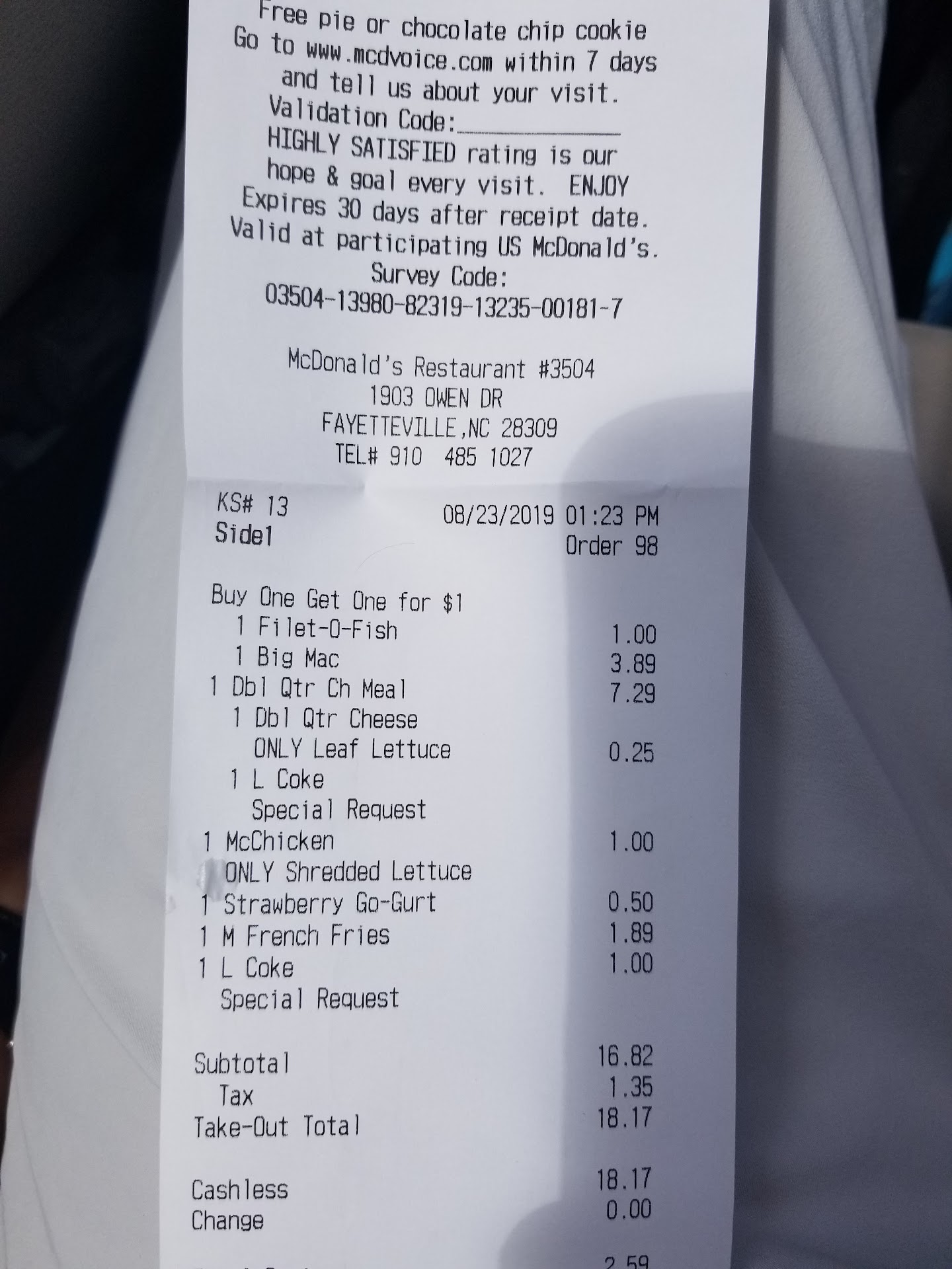 One last thing why does the cheese and lettuce and even the mustard and ketchup have to be in the box off to the side and just can't be applied to the hamburger. Sometimes I wish I could just eat the box so I could actually get what I pay for.When I am given a drink that is particularly filled, I believe I am being cheated out of what I have paid for. If I bought a gallon of gas I would certainly be mad if I knew the pump was pumping less than a gallon. It can't be hard to just fill the drink cup.