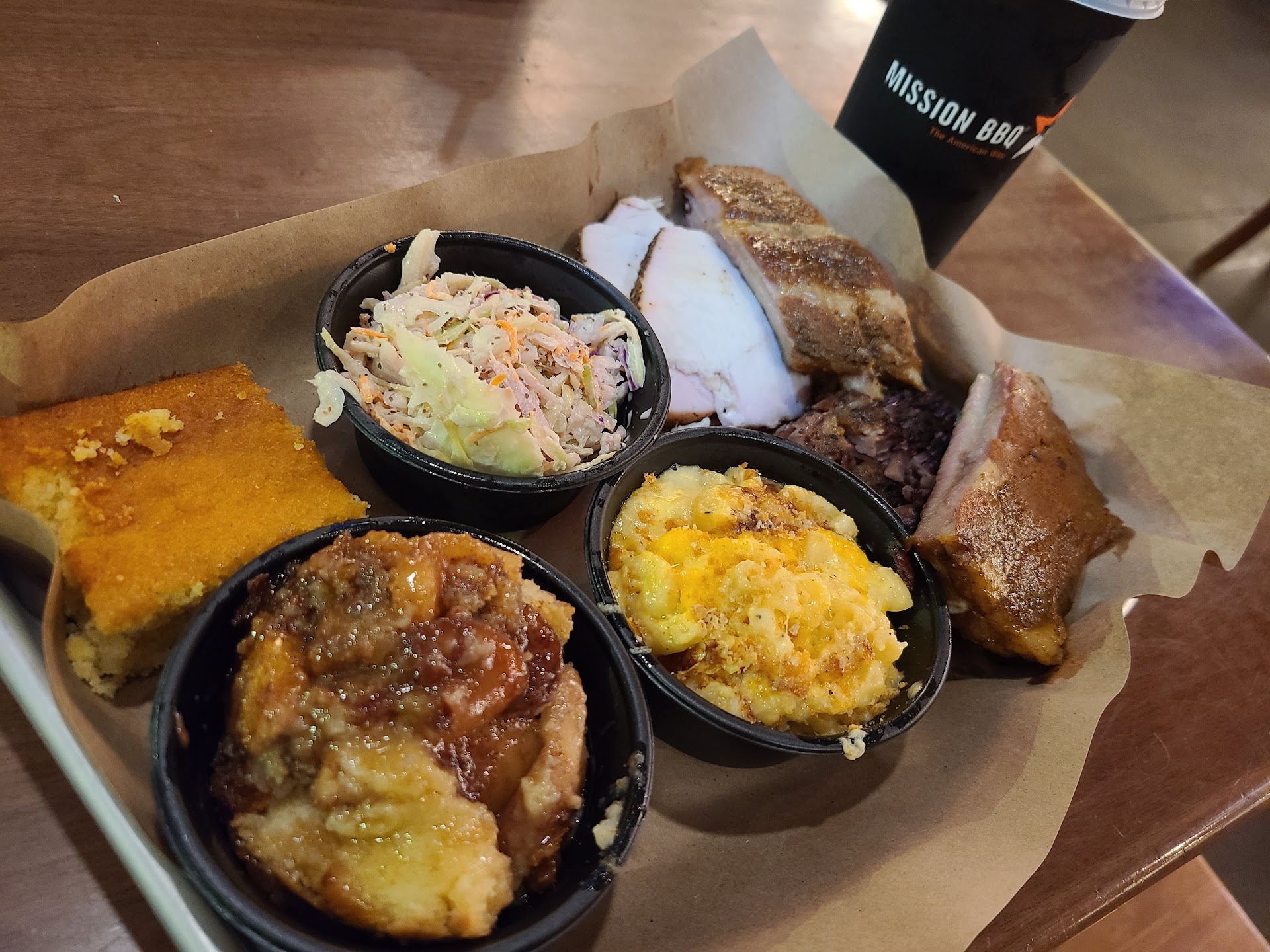 Read moreUm. Okay so the best way I can think to say this is due to cultural differences I was not impressed with the food from the meats to the sides. The Mac and cheese was great! The corn bread was great! The brisket was a little dry and kind of had a "crumbly" texture to it def lacked flavor. The pulled pork was not very flavorful at all and I had to season it when I got home . The cole slaw had too much pepper or celery salt which ever one it was. The potato salad was a BIG no but again....cultural differences. The collard greens tasted more like like turnip greens but overall was okay. Fries were standard. They have great sweet tea and lemonade. The atmosphere was good they had music and nice decor. Staff wise/customer service wise ppl just kind of stare at you lol I feel like in business if you look at a customer automatically you need to say hello or wave, smile SOMETHING don't just stare at me. There was a woman cleaning tables and she is the ONLY one that started a Convo asked how I was doing etc. Would I return? Most likely not. I spent almost 70$ for what I felt was 20-30$ flavor. Overall I give them a 2.5 out of 5 specifically because of the corn bread, Mac, and the lemonade/tea. Everything smelled sooooo good when they handed me the food but the taste....that's another story anyways thank you to the woman at the drink station who started a conversation and asked how I was doing etc you my dear...