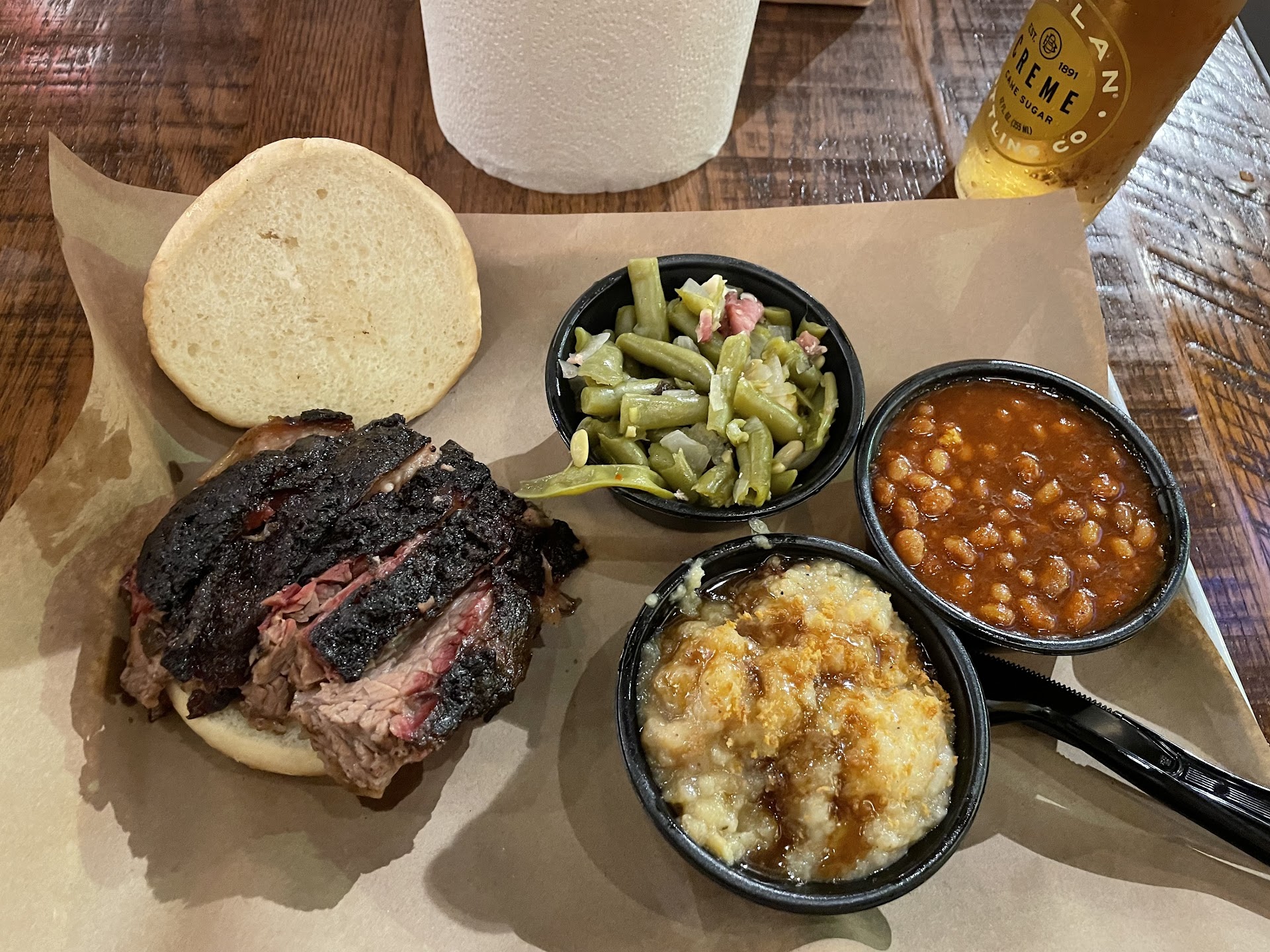 The pork is always tender and delicious, and the serving sizes are huge. The baked beans have a more liquid sauce rather than thick, but are still good. To add a little extra tang, I will mix in some of the Georgia Mustard sauce. The green beans are delicious, with an extra kick added. The cornbread is soft and moist.