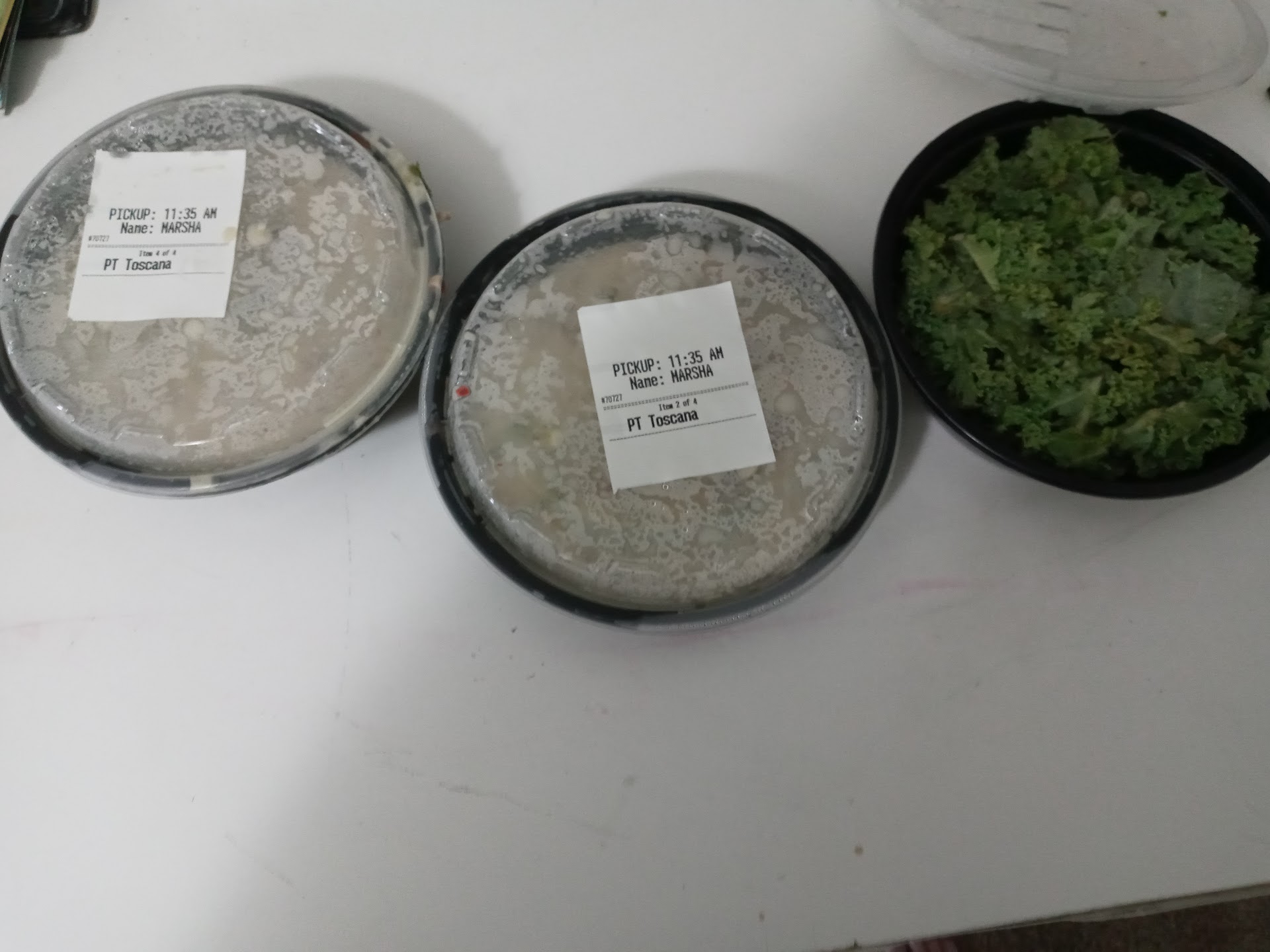 Read moreGet ready people, today was a Soap Opera. First thing that happened: I called in to place an order for two bowls of Toscana soup to go at 11:03. They said I could pick it up in 20 minutes. At 11:26, I get a text saying I can get it at 11:35. But, now I'm confused because right before the text was sent, I get a call from Fayetteville Olive Garden saying it won't be ready till 12:30. Wow. So I wait till 12:30. I get a call at 12:11 saying it is ready. Ok, no problem. Mild soap opera. But while the girl is on the phone I ask, could I pay to get two bread sticks to go with the two bowls of soups I bought. She say said "No, you can order the 6 or the 12 bread sticks." Problem: What am I supposed to do with 4 extra bread sticks when one bread stick is enough per bowl?! Why would I want to eat more than what my body can handle? And NOOOO, I will not save it for future eating when one bowl today and one bowl tomorrow will be enough food for lunchtime and I REFUSE to overstuff my gut on the bread sticks when one bread stick is enough per bowl, and no, I have enough food in the freezer to freeze them. Therefore, because this location refuses to sell just two measly bread sticks to accommodate an unwanted overstuffed gut, I will boycott this location. Plus the fact that I refused to purchase any bread sticks. Oh, the soap opera gets worse. Over the years I have purchased to go Toscana soup and always gotten the extra kale that I asked for. Never has there been a problem till today. Today, someone made the decision to NOT put the extra kale in the soup but rather put it in a to go container!! What?! Were the unspoken instructions supposed to have been to put everything in a pot at home and then dump the kale in it and cook it myself??!! Who is the stupid that decided THAT??!! The manager?! Is he NEW?! Does the new manager make new rules now about how that extra kale is to be handled?! Was it someone else that made that decision on their own because NO-ONE TRAINED THEM?! Then the many questions I have are 1. Why didn't the newbie ask what to do with the extra kale?! 2. Why wasn't the newbie cook trained with supervision?! Why is there no communication between newbies and the managers?! Are you letting the newbies train the newbies? Here's a goody, when the girl handed me my bag and I saw that there was that extra kale but in a separate bowl, uncooked raw, I asked her why they would do that, and her answer was " I don't know, they're supposed cook extra kale with the rest of the soup. I don't know why they would stick the extra kale separately in another bowl. And here is the picture to prove...