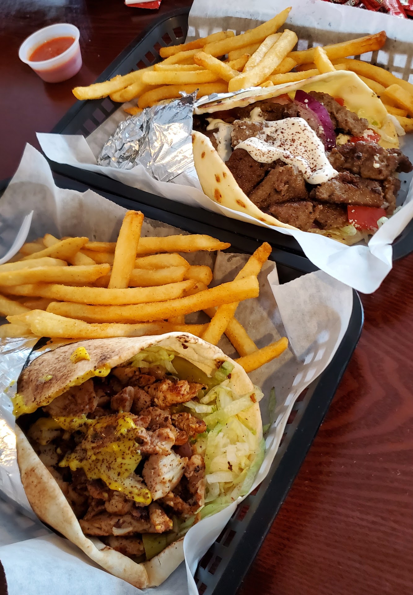BUT, back at the register we decided to go for the Chicken Shawarma and Gyro Wraps + French Fries. We also got sides of their garlic sauce and hot sauce for some additional jazz. Food was made fresh after we ordered and delivered to our table piping hot. The wraps were massive but my intense hunger didn't flinch. We scarfed down the wraps at lightning speed leaving the fries lurking in the trays. Don't worry though, we took good care of them too. Needless to say, our bellies were satisfied and we had made yet another epic lunch decision.