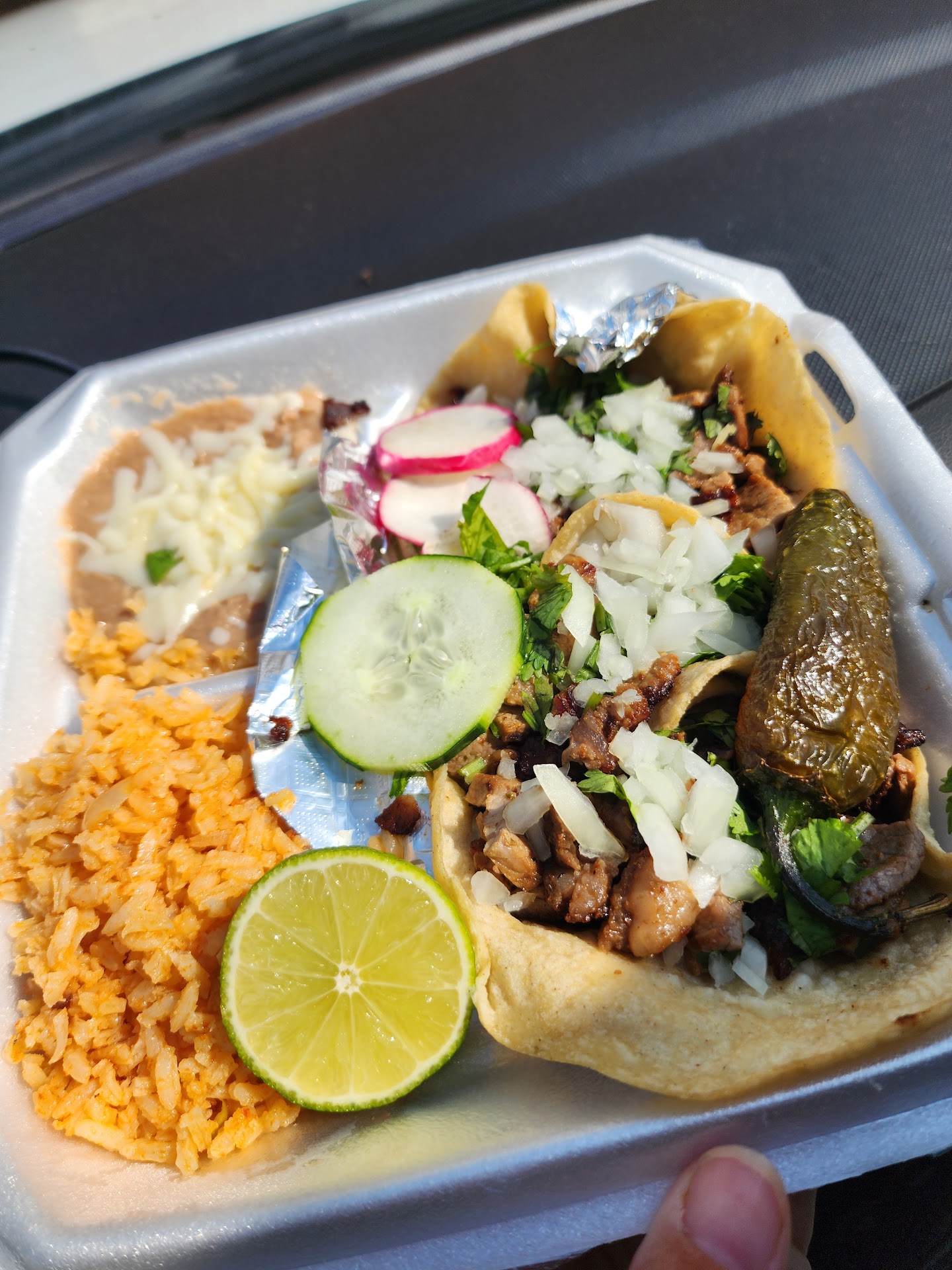 I ordered the 3 carne asada tacos with rice & beans. It also came with chips & plenty of salsas.