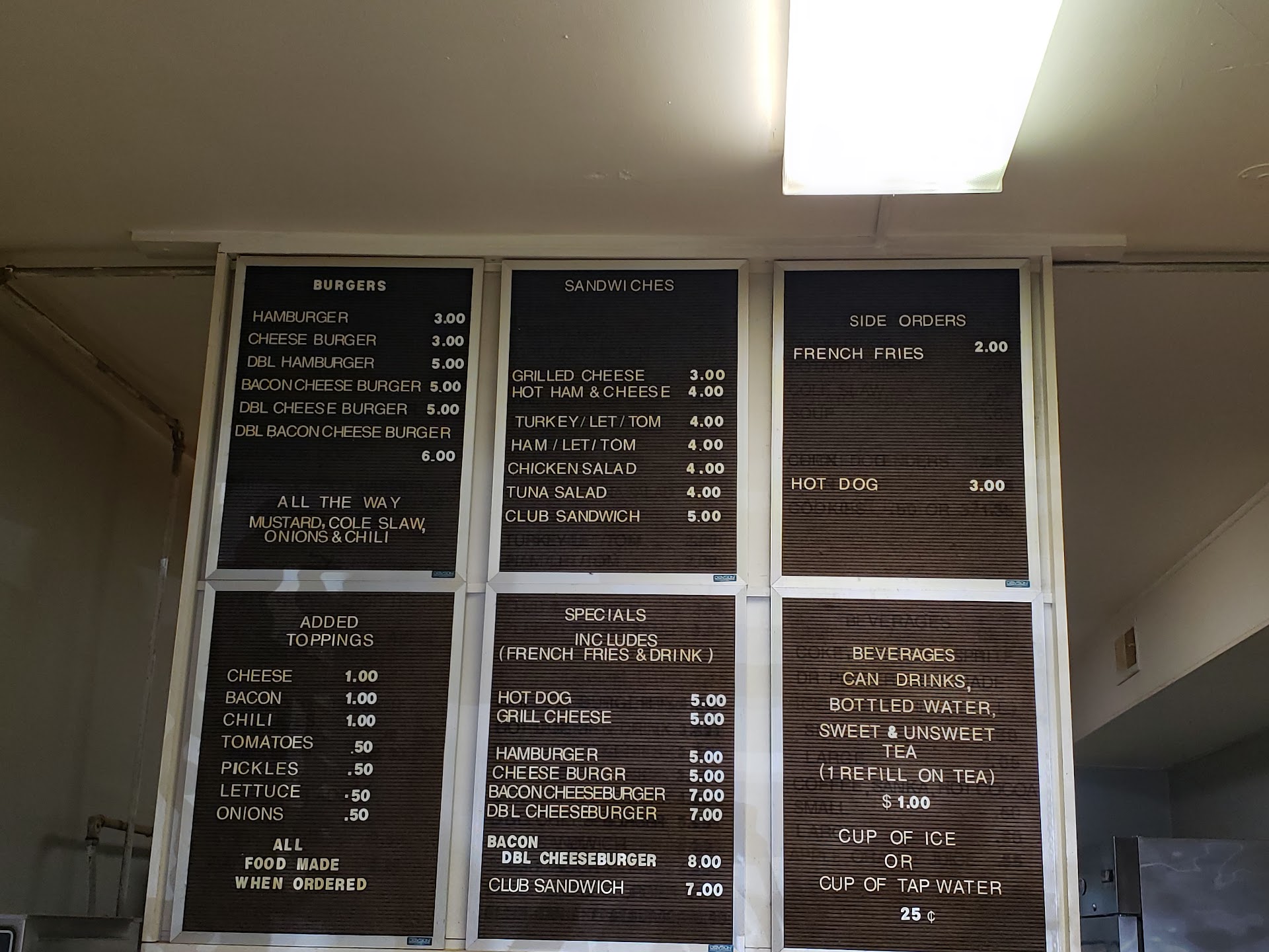 2018 - Great food at a very affordable price. This is a cash only place and that helps keep the prices down. Burgers, chicken salad, tuna salad, and ice tea are hand made daily. This is NOT a fast food place so expect a little wait. Your order is made when you order it and if you get fries they, too, are made when...