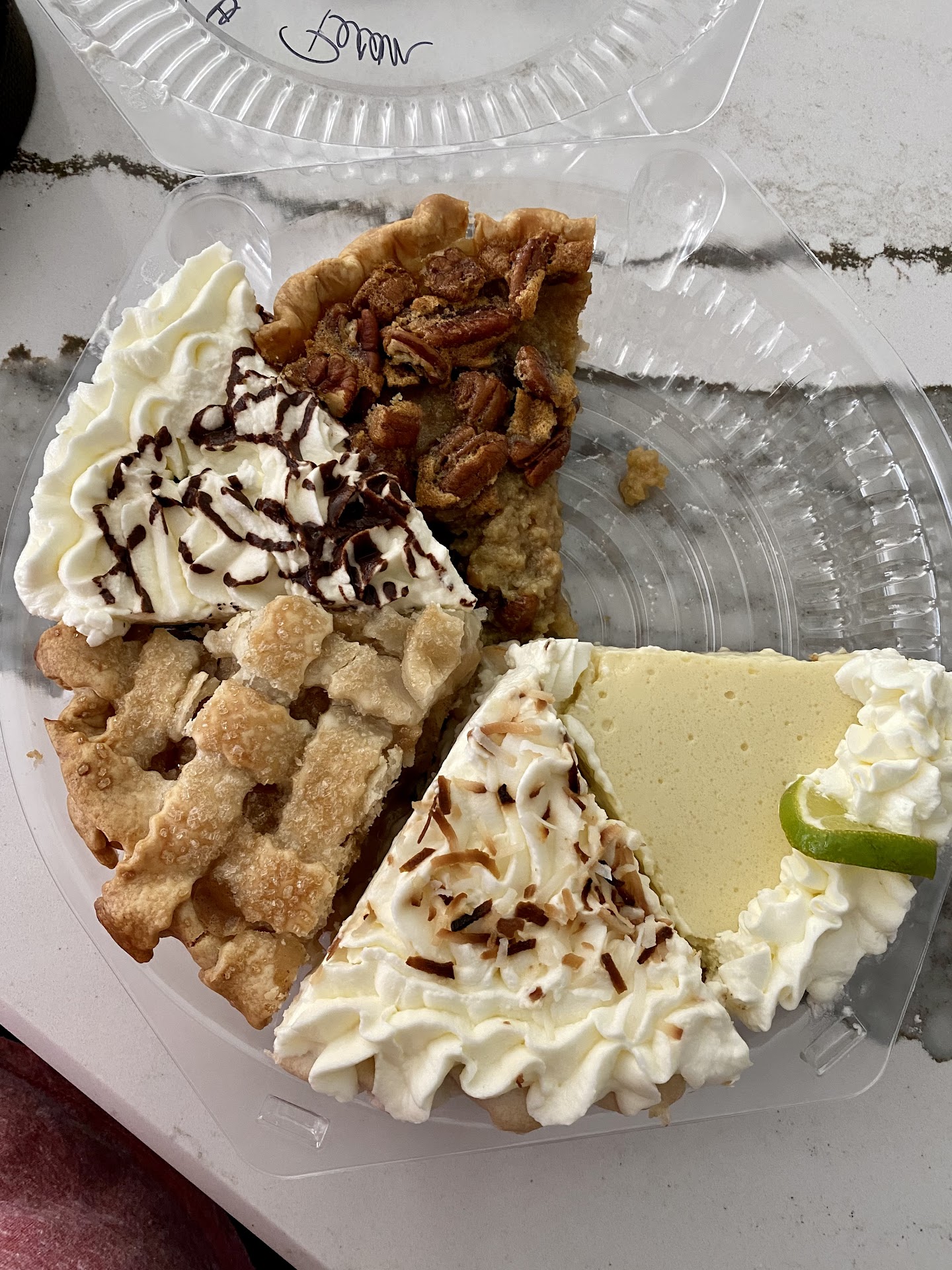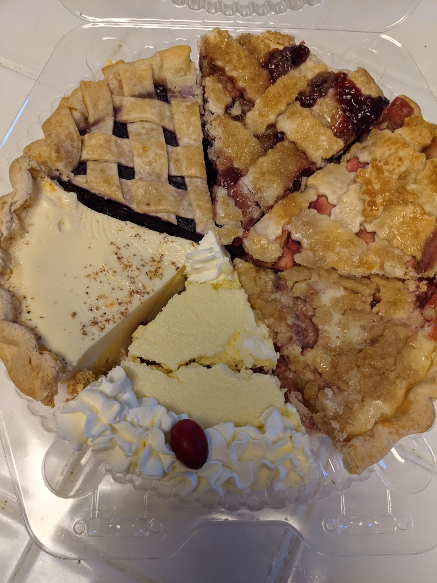 My husband wanted to surprise me wish a stop at this local pie shop for some dessert. Here are my thoughts: first/ the blonde young lady manning the counter was BY FAR the best part of this experience. She was delightful. several pies available- some looked pretty good while others looked old and crusted over - saw 2 Easter themed pies on 5/1. there are A LOT of OLD Nick nacks literally everywhere/ very old items strewn about - sitting inside the pie cabinet etc. this gives “unclean” vibes. It just does. -no chocolate, French silk, coconut, banana cream, or pecan available. Tons of very different fruit variations. Most of these are stored in a pie cabinet/ room temp and uncovered. It may be perfectly in line with health department guidelines but it was quite unappetizing there were several flies in the store and 2 in the pie cabinet. These were common house flies not fruit flies. there was a person posted up in a booth with laptop playing games / feet up on the booth seat- looked to maybe they are employed there or maybe a relative of the owner. When “they” got up to “help” serve pies we didn’t see them wash their hands. we ordered 2 slices from the refrigerated area thinking this was the safest bet. My custard pie was ok.. not great by any means.