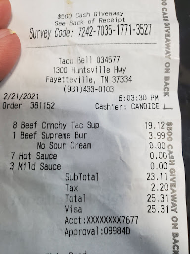 Read moreI'm not a person that writes reviews but i had to this time.It had been a long time since I had been to a taco bell for food because of food quality being poor and health concerns. You know how it is, you think " well I haven't been there in a long time so I will go ahead and try again ", which turned out to be a bad decision once again. The Mexican pizza used to be so delicious but in past few years become more and more not delicious or well made. I ordered the Mexican pizza and when I took a bite something didn't taste right, I took a few more bites and with each bite it was worse. I threw the rest of it in the garbage and have spent the last few hours extremely sick from this experience! Never again taco bell. On a brighter note, the lady that took my order at drive thru was very nice (2 days later, still sick from...