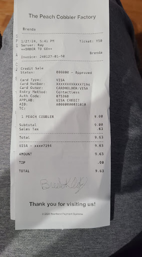 Read moreI was so excited to visit Peach cobbler factory in Fayetteville. When I arrived the only associate at the counter turned away instead of greeting me. I was patient and in another 20 seconds she came back chewing food and said hello. This was my first visit and the menu was a little overwhelming. I asked a few questions and she appeared a bit annoyed. I soon figured out it was frustration with the only other team member in the store as he began yelling at her from the kitchen about supplies. My intuition said- “leave”but I didn’t because my tastebuds were already set! After placing my order with a mouthful of food, she set the expectation of 10mins for my order to be ready.