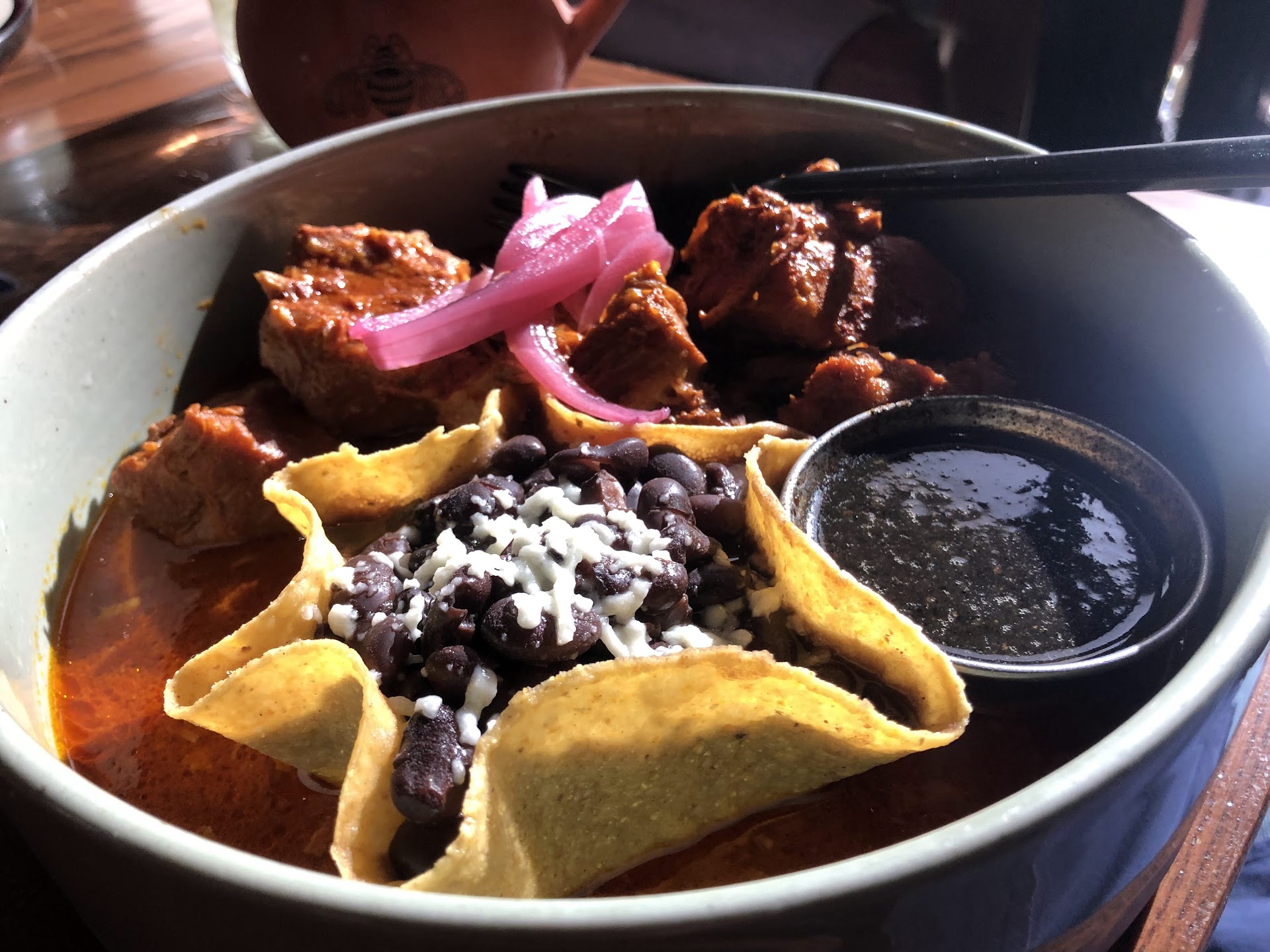 So the food....just amazing. Everything we had was just so good and not "typical" for any of the other Mexican food we have had in the area. Actually, I haven't Mexican food this good since I visited Mexico City. Just great. We had the Queso Fundido, which we fought over...the tortillas smelled so good and you can taste the masa. Fantastic. She had the Carne Asada, which was good but nothing unusual. I had the Pozole Verde...wow, in love. The spice was perfect and builds over the whole meal. Pork was tender and just tasty. Drinks were A+ and I would visit just for these alone. Shame the bar wasn't as inviting as the dining room.