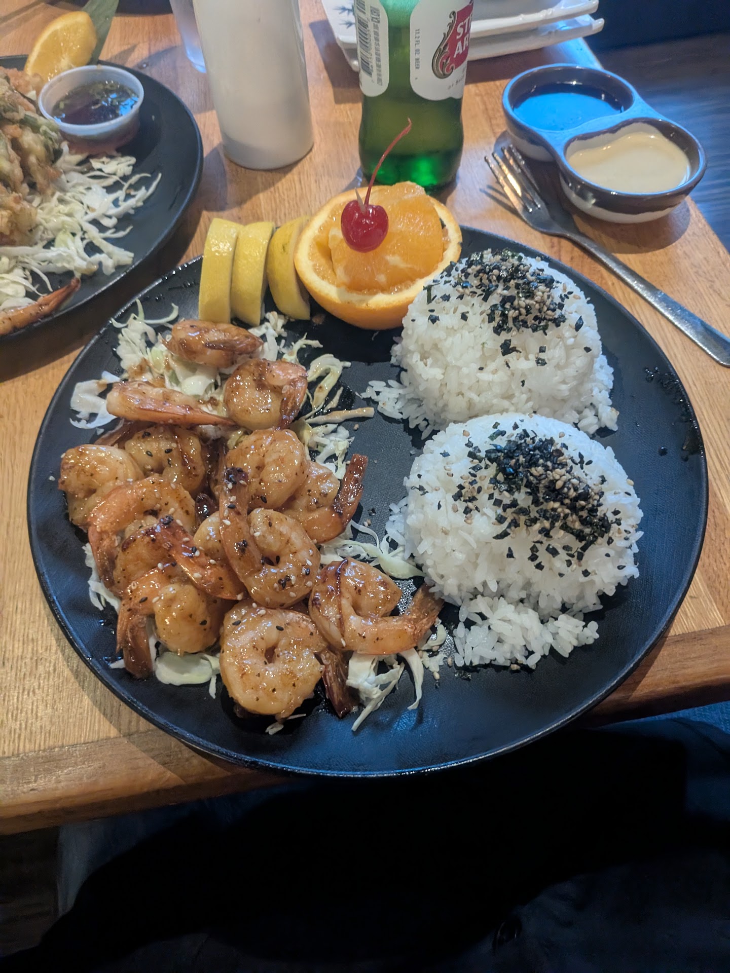 I ordered the shrimp hibachi and my wife got chicken. My shrimp was ok. It had ok flavor, it just didn't feel like it was cooked on a hibachi grill. Same with my wife's chicken. To me it looked like the chicken was sliced up raw, marinated and cooked in a pan. She said it was meh. None of the meat had any type of sear on it. So between that and not having the cook there at the table it just didn't feel like we were having hibachi.