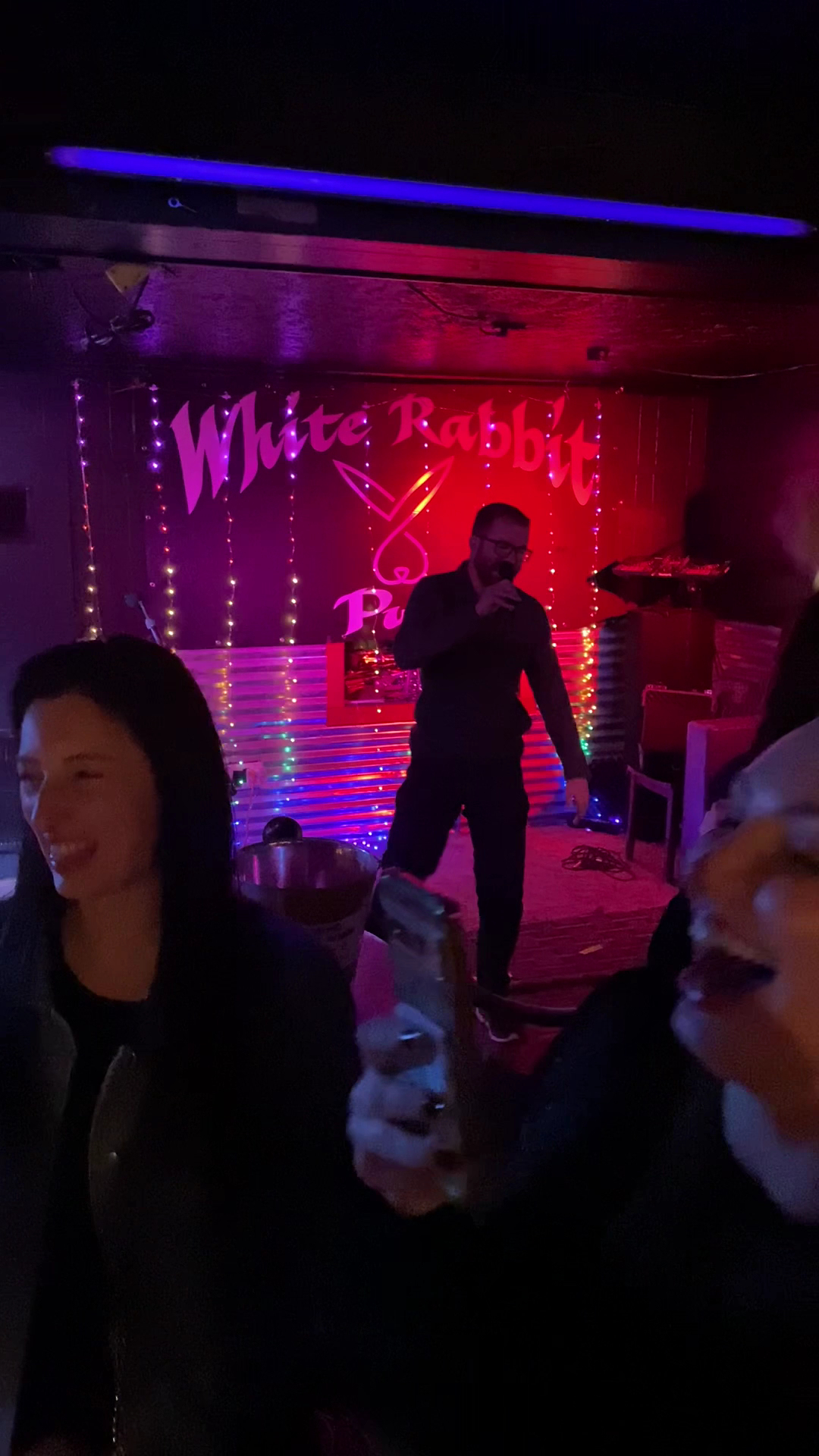 Read more1:00 am we left after having a great time. We had drinks, beer, shot a bunch of pool, played corn hole outside and listened to karaoke. I gotta tell you this was me and my lady's first time here and we were blown away by the diversity of the crowd. Younger people, older people, military, hippies, rockers, country, gay, straight and I think every race was there. Everybody having fun, no troublemakers. The singers were impressive. A black woman sung Black Sabbaths Warpigs and freaking killed it! She was so good. Hope to hear her again. Thats some of the good, now the bad, which I hate to point out but a reviews no good doing a review thats not totally honest. This bar is dirty, dark and does not waste any money on decor. When we arrived, I was ready to leave. The place was slow at 9:00 pm, the karaoke dj was late and I saw 2 roaches on the floor by the pool tables. I was almost out of there but we stuck it out and had a great time. Drinks reasonably priced. We will go back. Even though it wasn't as clean as it could have been, we had a great time. The people make the bar and the White Rabbit has all kinds!...