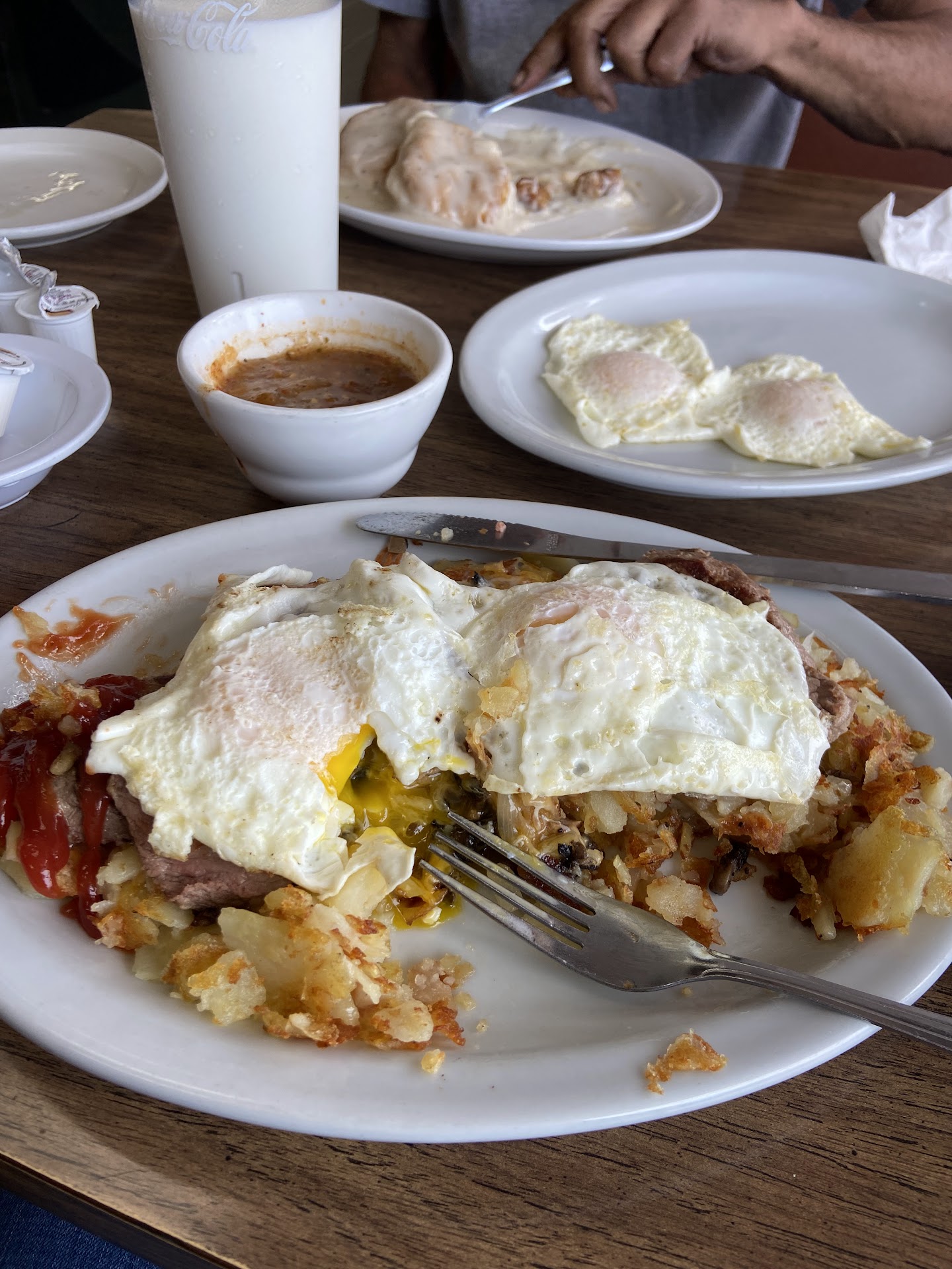 Love their breakfast skillets, Santa Fe breakfast plate, eggs, hash browns biscuits and gravy, breakfast burritos, pancakes, French toast, pancakes South of the boarder menu, omelettes, mimosa.