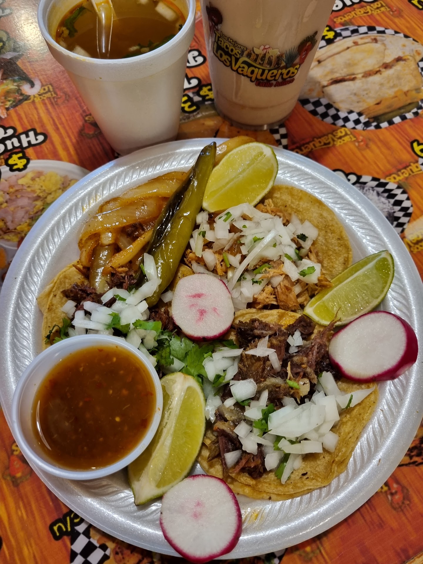Read moreReally good food, ordered tacos, menudo, churros and a hamburger. The tacos we had were asada, birria, al pastor. My mom said the menudo was really good but it was spicier than she prefers if you like it hot. The burger my sister ate came with cheese lettuce tomatoes and avocado she said it was surprisingly good and came with fries. The tacos were really good and flavorful they had 3 different salsa options, red, green and then the avocado salsa 😋. Would definitely come back if I was on that side of town. Also while we were there the line never stopped they stay really busy there. Not to forget, the church's came with like 6 pieces and ice cream in the middle, they were fresh...