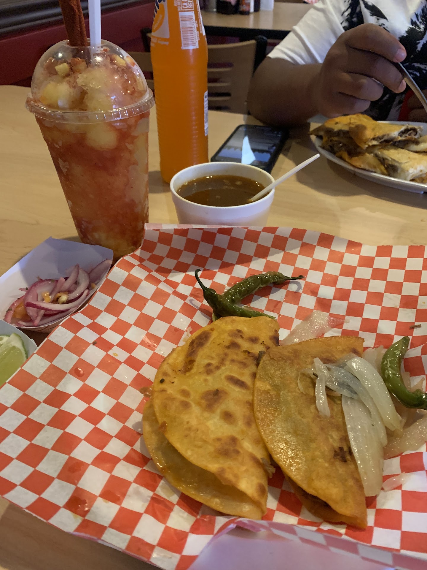 The food was absolutely beyond good! We had a little of everything to try variety (Birria Taco, Dorado De Birria, Cheese Birrira, Plato De Quesabirria, Consome, Birria Ramen) and definitely enjoyed it all! We appreciated that they had a self serve refrigerated bar at no extra cost for the pickled fixings, salsas, limes, onions, etc… You can’t go wrong with any of their tacos; either with cheese or without… The beef in any of their tacos was so tender & the consome was flavorful all on its own… I had to get more of it and ordered more in the form of their Birria Ramen Noodles (definitely the highlight of our late lunch). We finished off with a Mangonada and Churos to go… All I can say is there was none left once the kids got their hands on them 😭… For the great flavorful food; the price was even better! Our entire meal: 3 Appetizers, 2 Entrees, 2 Deserts, 2 drinks was just $60 before tax and tip. We definitely will be back either to dine in or order...