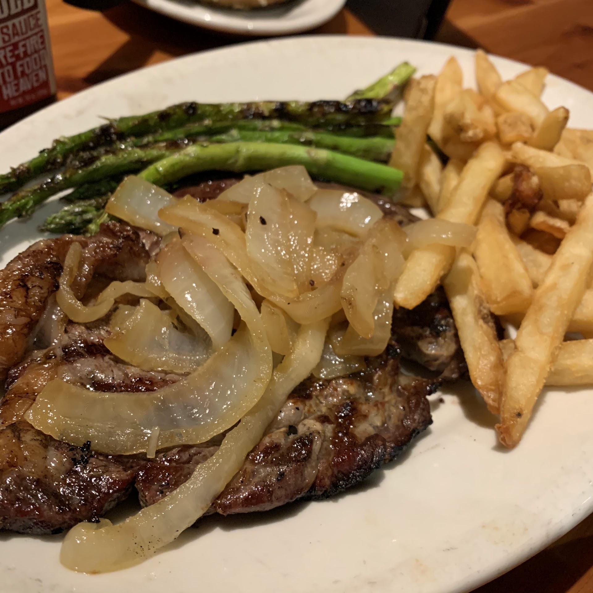 Once the steaks arrived, they were served by the manager. He asked us to cut into them to check them. At this point, I was kinda over the whole thing. Mine was suppose to be medium-well which should have some pink in it (according to their pictures in the menu). There was none. I said what I needed to to get him away so I could just get this over with. Both of us were raised in east Texas - we KNOW steak. This stuff was dry, gristly, and unfortunately needed A1 or something to mask the poor quality of the meat. Properly cooked steaks do not require steak sauce. I am telling you I at 20% of my steak at the restaurant and the Texan in me couldn't go any further. The best thing on my plate was the mac and cheese and the adult beverage.
