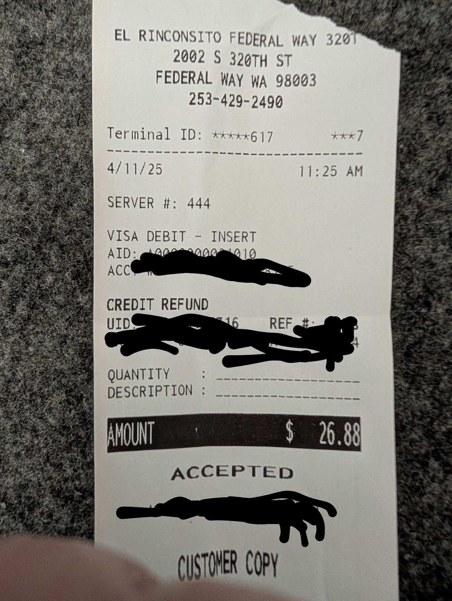 He reaches out to shake my hand and says "my name is (Paul I think ๐ค) I'm the regional manager..." He takes a picture of Sound's accounting, and apologized sincerely. He then tells the manager something technical about how to do it. Not being one to let an opportunity for some gratis slip away, I said feigning being coy "you know, a carne asada torta wouldn't hurt." He didn't skip a beat "Well absolutely." And then a quizzical "really, that's it?" Yeah.