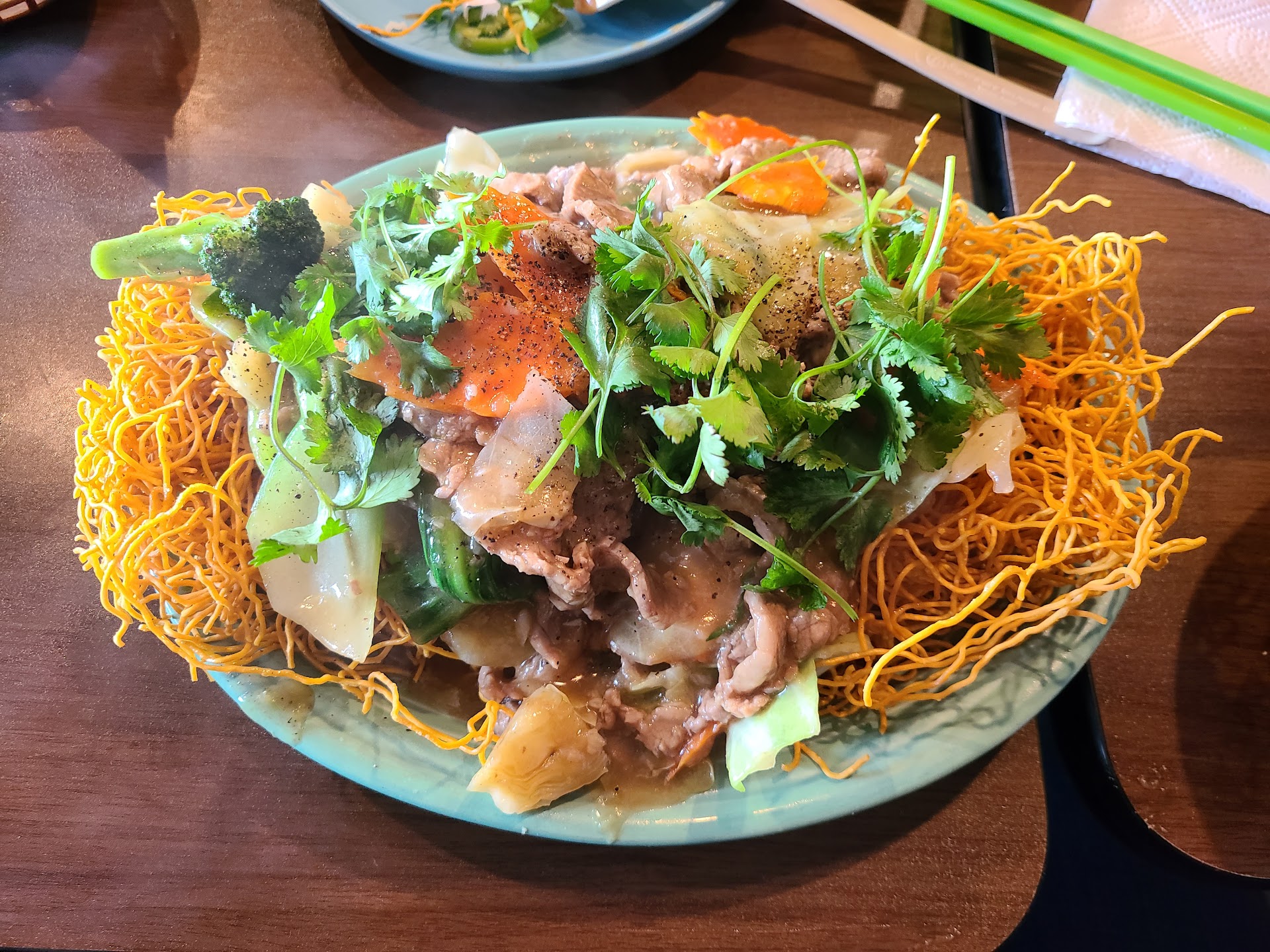 My wife had the Bo Koh, or beef stew, and found it to be a bit more soupy than she usually likes. It tasted more like the pho broth, except for the coloring, which was different. Also, we needed a water refill. We were thirsty, drank all our water, and were looking for more, but the server was busy.