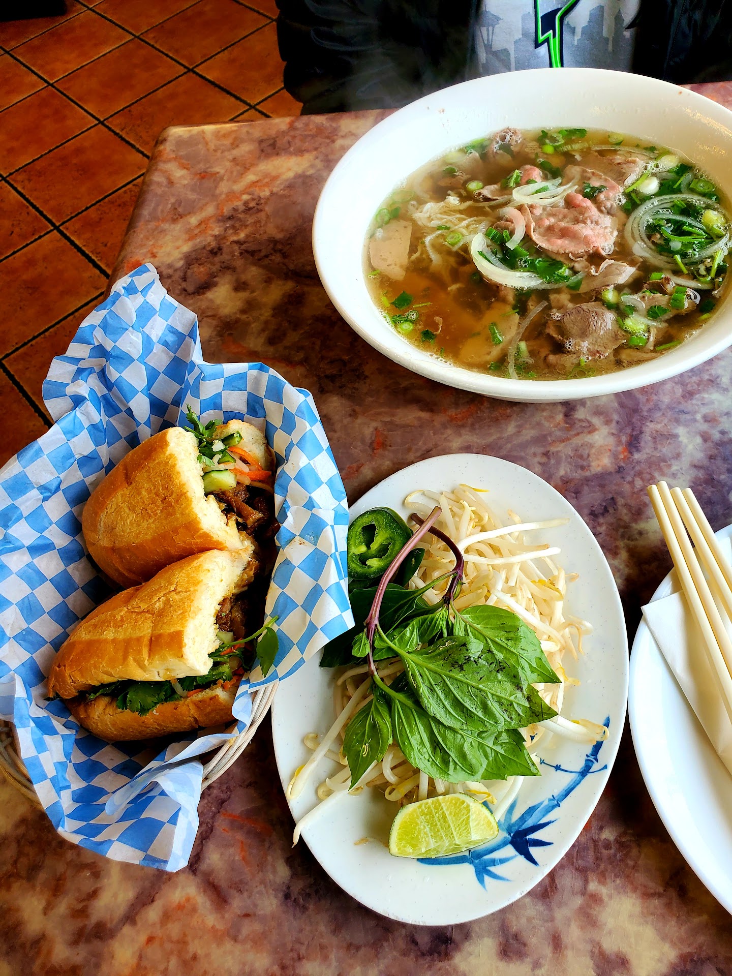 Read moreI had a supper with a friend here in the evening with a light rain. Parking is also nearby and is in a convenient corner, but it can sometimes be overlooked. I haven't eaten out for a long time, There is a distance between the tables for a small number of customers in the store. I took a seat by the window. I sometimes want to eat Vietnamese noodles, sandwich or fresh spring rolls asexually and I eat those everywhere. I chose #1 pho and sandwich pork from the menu. I used the toilet while I was waiting. Clean but there are two doors to use the toilet, and I was careful because it is a part that I can touch with my hands. We shared and ate a large pho and a sandwich. I felt that the pho soup had a light taste and was unsatisfactory, but the thinly sliced meat was tender and delicious. Pork sandwiche is easy to eat with pork & sweet BBQ sauce. There is also a doordash service and there is a pick-up table near the entrance. This is a convenient service and I recommend...