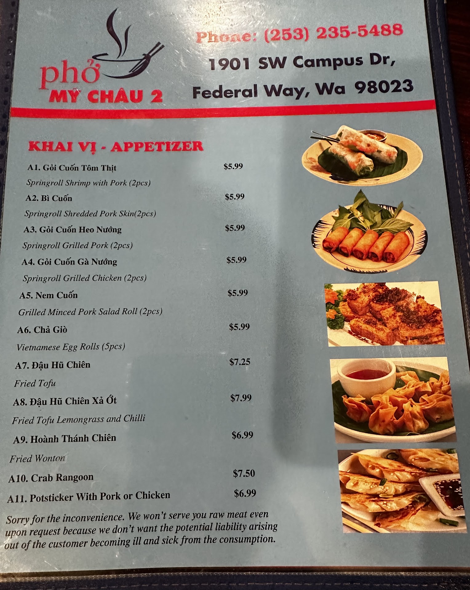 Ā Ā Ā Read moreThis place had a high rating and great reviews so I thought Iād try it out. After coming here I think a lot of the reviews are fake. Either that or maybe the other location is good and they accidentally left the review here instead of Seattle. The food was just okay. The service was just okay. Disappointed that their website is inaccurate with the description and prices. The pork chop plate did not come with a side of beef broth (I was looking forward to trying it) and all the prices were more expensive in person than on their website. The prices are average compared to most pho places Iāve been to outside the city of Seattle and you also get what you pay for, average food. I did like that the chicken pho came with bok choy but the jalapeƱos were thin and dry. The pork chop plate had a small portion of meat compared to all the Vietnamese restaurants Iāve been to. It was also boneless and cut up which made it worse. The Vietnamese egg rolls had so many layers of wrap that they were too thick to get cooked all the way through. Only the outer layer was crunchy and all the other layers were uncooked and mushy. Definitely not worth the money to go here even though it was only $35...