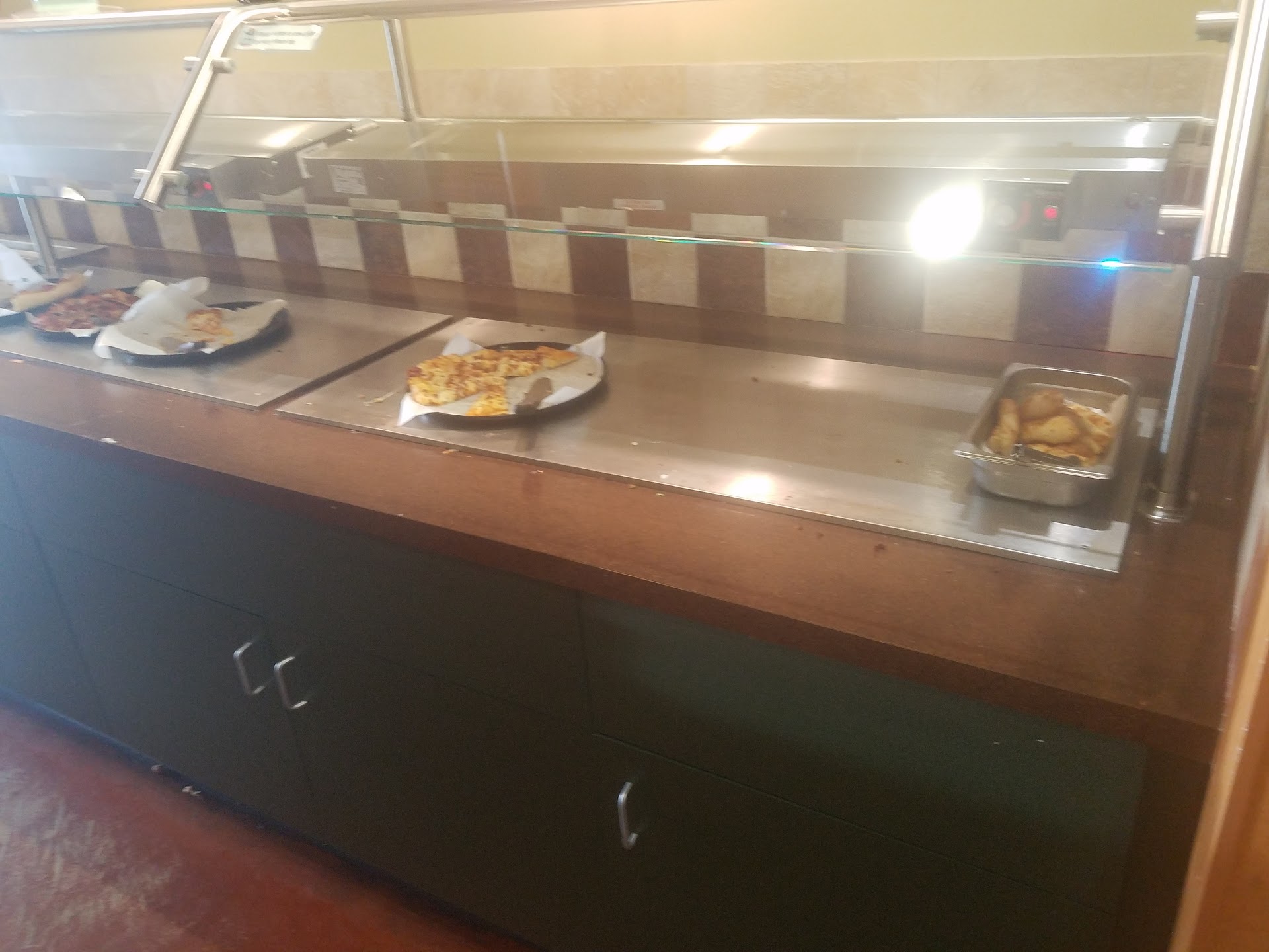 This experience suffered not from poor service (on the contrary, I found the front counter person very friendly and helpful in spite of being quite swamped) or poor pizza (what I found to eat on the buffet was well made and properly cooked) but the choices of pizzas displayed on the buffet were horrible. We were all hovering, waiting for something not slathered with jalapeno to come out, but since nothing was getting eaten, nothing new was arriving.