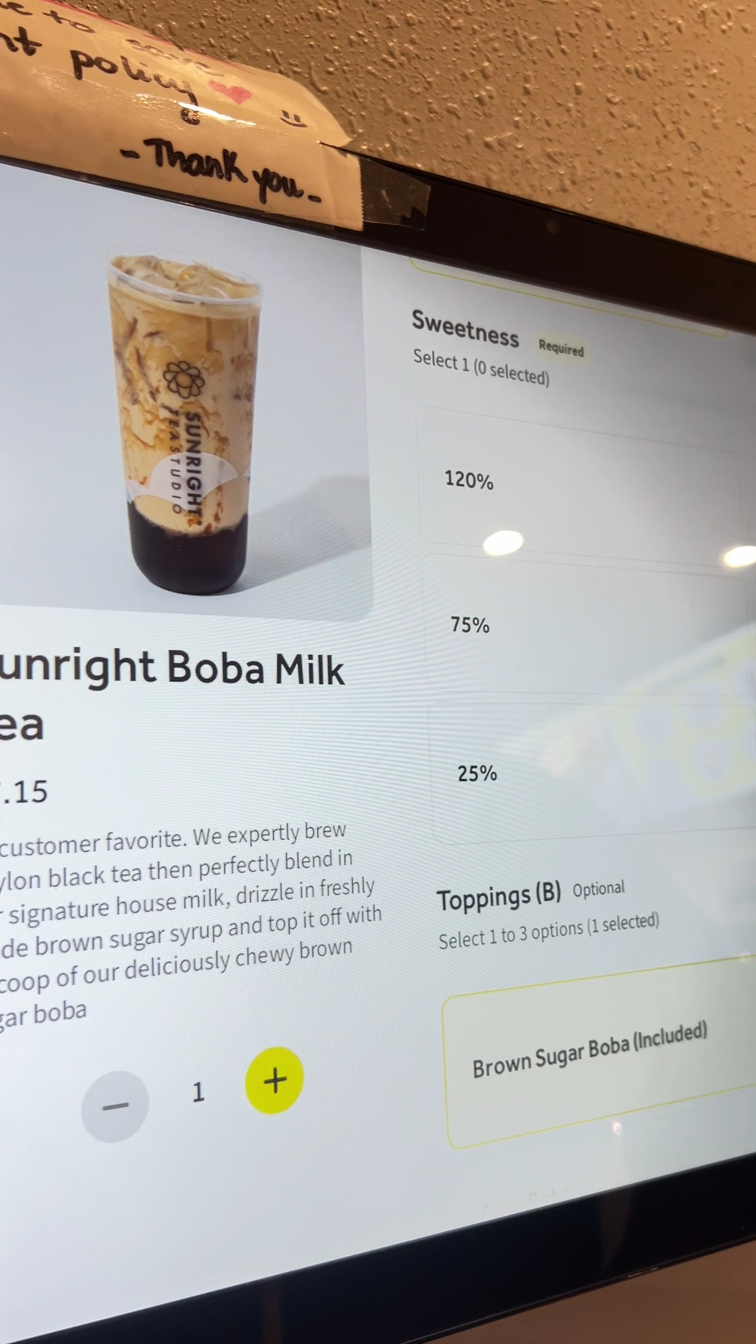 Weâre loyal customers of Sunright and usually love stopping by for our milk tea fix. Today, though, was really disappointing. We placed our order through the kiosk as usual and were excited to use a hard-earned reward we had saved up. But when it came time to check out, the machine gave an error and said it couldnât process the rewardâthen it just disappeared from our account.