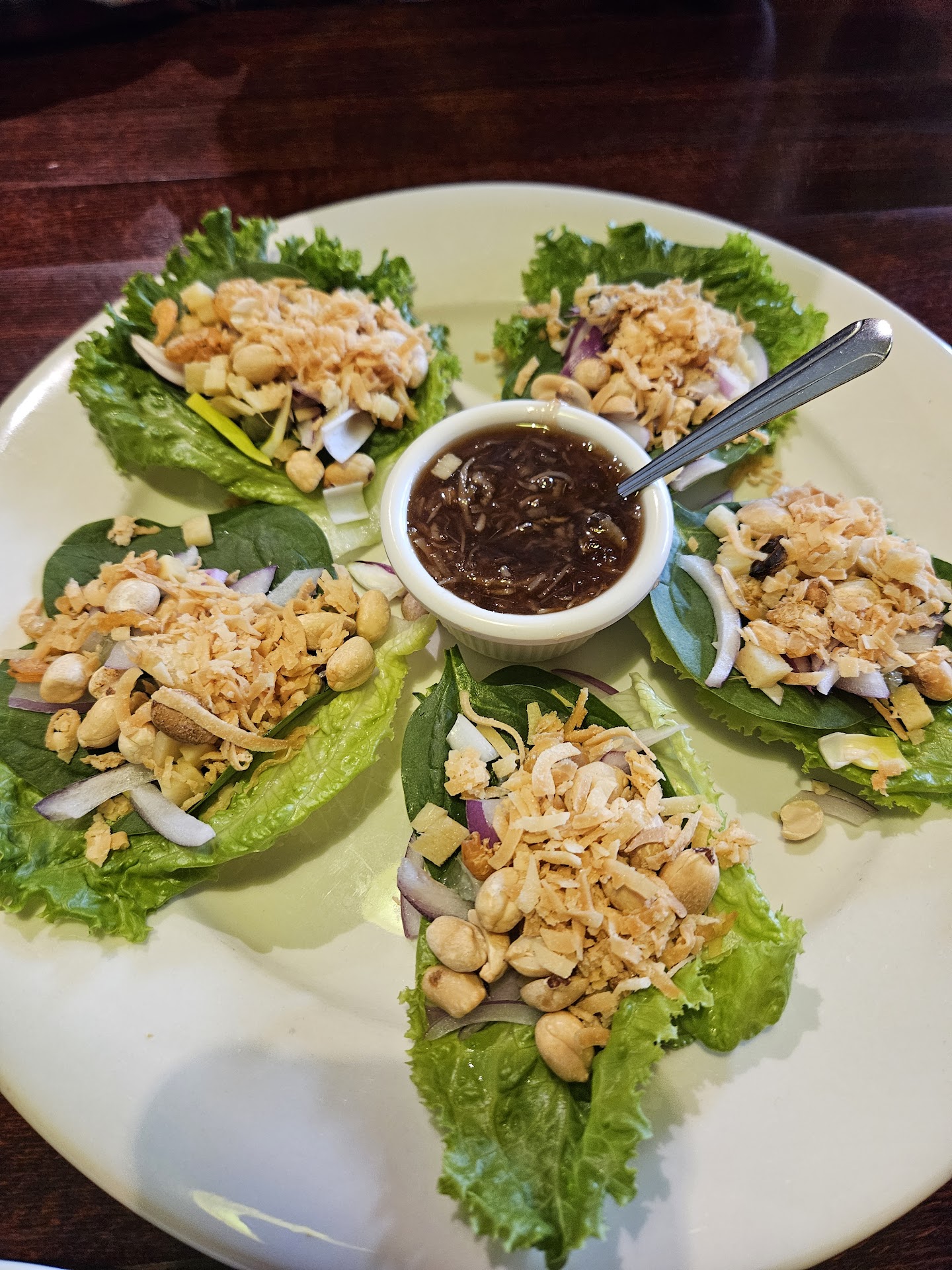 Read moreThe food here is a pure flavour bomb. It was so hard to choose what to eat because everything on the menu sounded so delicious. We ended up with Chicken Pad Thai, Crispy noodles with chicken, shrimp, squid and beef and they were both fantastic. We also had an appetizer which was a Thai version of a lettuce wrap but it's made with pieces of lime, peanuts, toasted coconut, dried shrimp, onions, ginger and spinach. At first I was like IDK if I like this because of the huge sour punch from the lime but by the end of the second bite I was loving it. It was incredibly refreshing and the gingery tamarind sauce that came with it was the perfect accompaniment. My Pad Thai was a little sweet for my liking but it was still fantastic and the chicken helped to bring up the savory notes. My husband's crispy noodle dish was perfect. The noodles were well fried, not greasy and the oil they used to fry them was fresh. They served the protein with sauce separately so you can either keep your noodles crispy or mix it all together. The meats were tender, the vegetables were crisp and everything was served hot. This is also a great place for a date. The music isn't loud, the decore is beautiful and the ambiance is kind of romantic. It was an excellent dining experience we will definitely be...