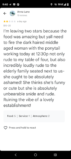 A great server, who almost always gets tipped more than the 20%, has multiple regulars coming back asking for her, been there 4 years and has become one of the most reliable servers. Customers like her bold personality, they like being intrigued, instead of a quiet boring server. Guest are there for the food, atmosphere and the experience . Every once in a blue a guest who is not familiar with the servers personality gets offended or takes it the wrong way despite the excellent service they still had. This cost this server her job. Despite being there 4 years , in good with the key employees, manager and owner . All are people that been her friends ,drank with at employee christmas parties, beach days, etc, in her past 4 years and no one had her back? All it took was one bad review and BOOM she's done ? Did Manager even see this happen ? Nope. They believed the review and did exactly what the customer wanted ,no questions asked. Nobody had her back?